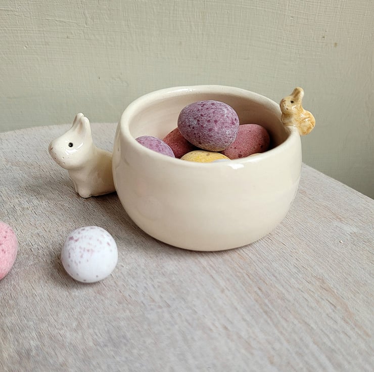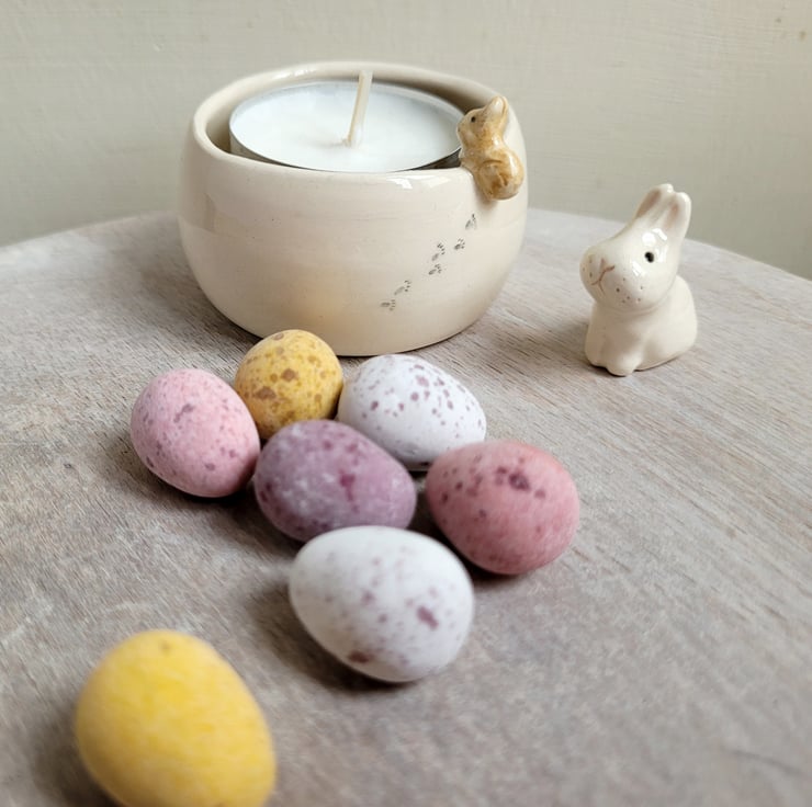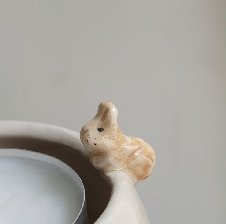 This little pot has a tiny bunny sitting on the edge and miniature foot steps pushed into the clay at the side of the pot . Perfect little candle companion.