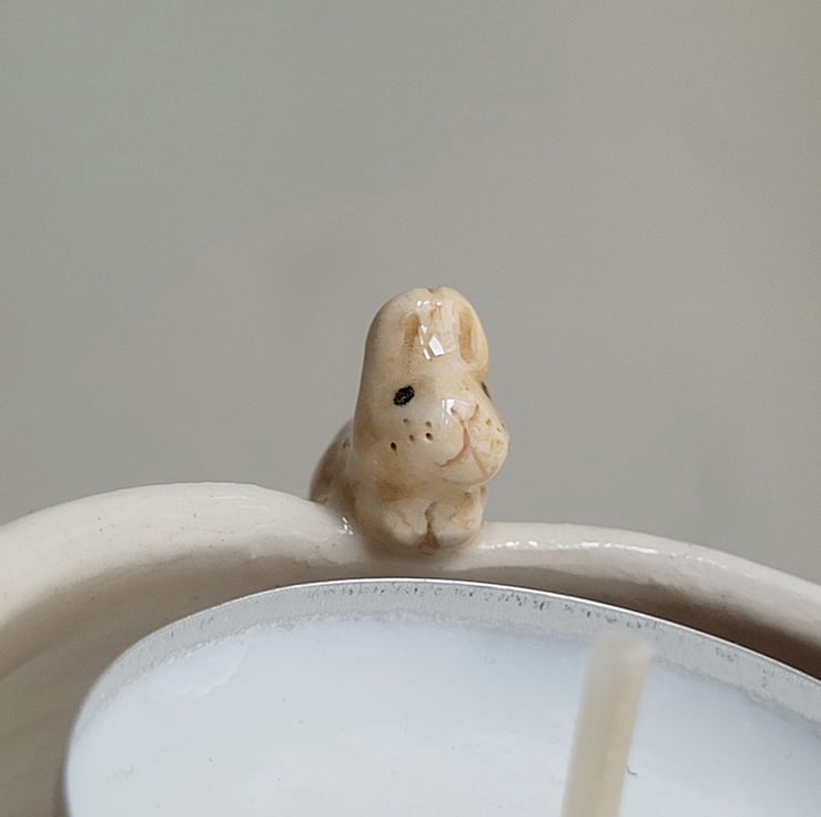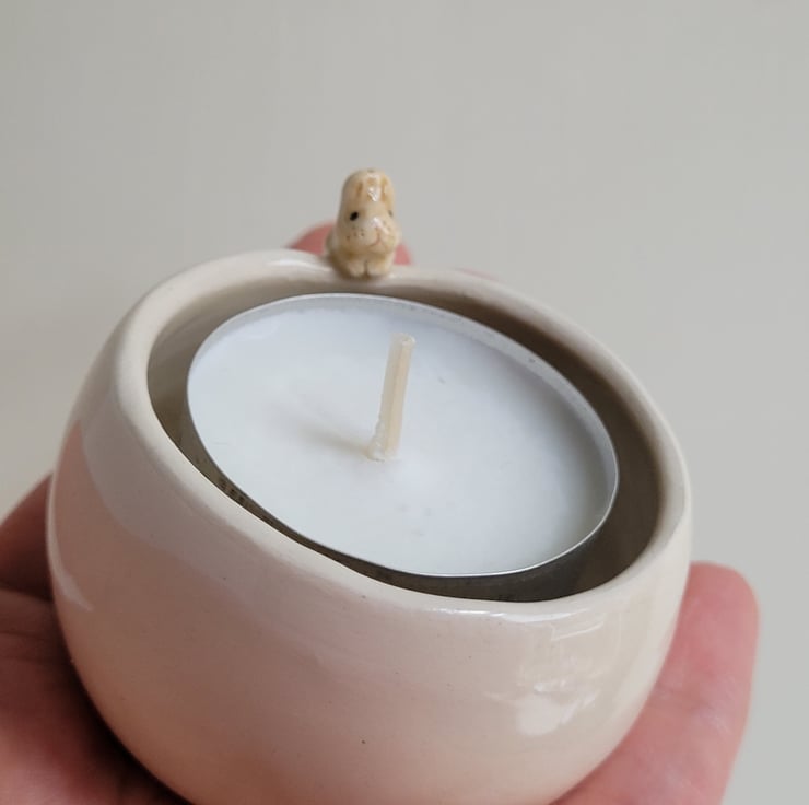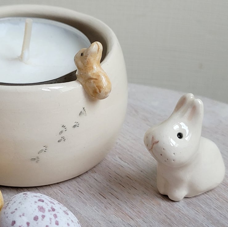 Pottery tea light candle holder with a tiny beige bunny rabbit and pawprints.