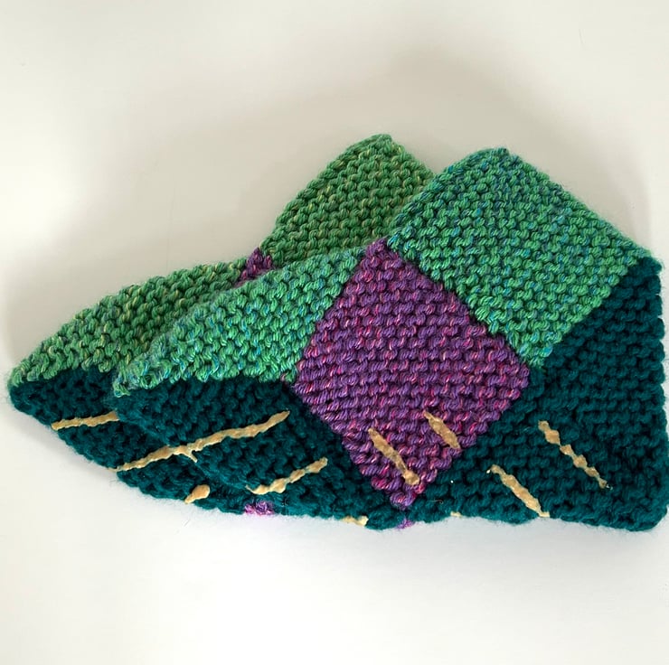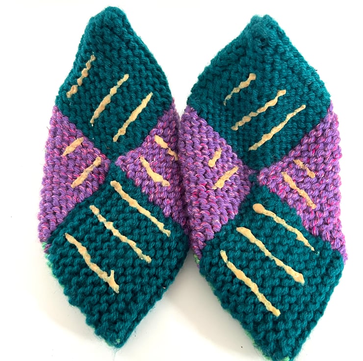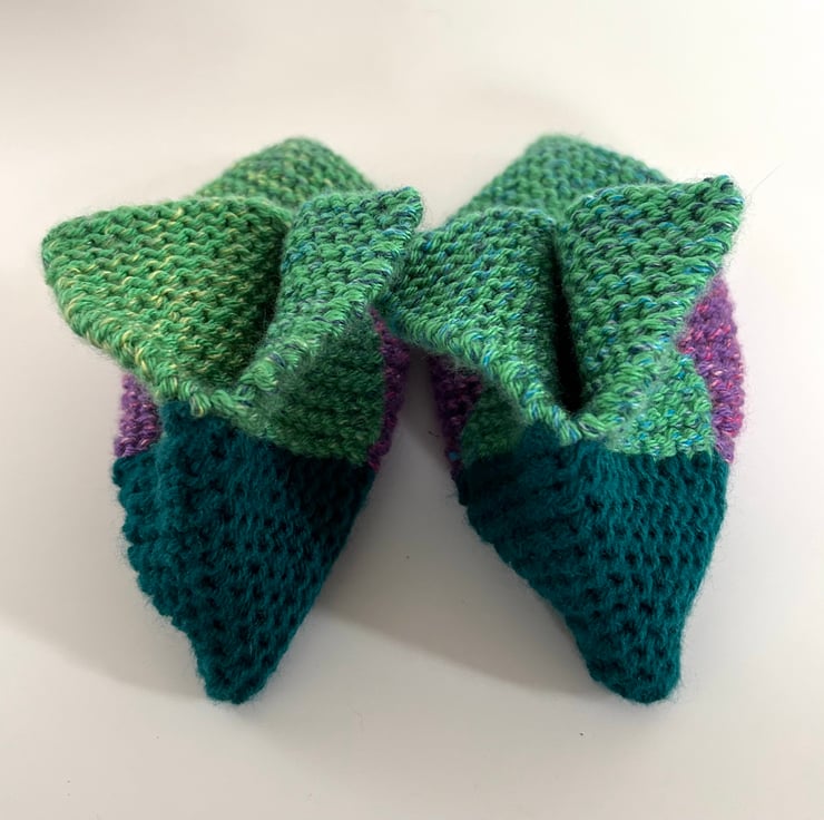 These have non-slip stripes underneath and are designed to be worn with or without socks, around the house or in bed to keep your feet warm. They are handknitted in a teal yarn, a purple yarn and a variegated green yarn. They stretch to fit and are really cosy.
