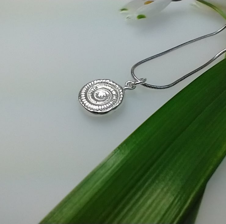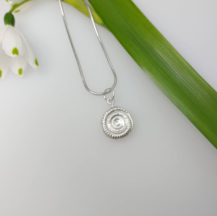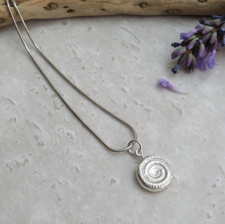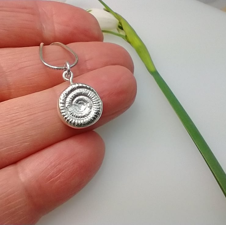 This is a sweet little fine silver fossil ammonite pendant on a sterling silver snake chain.