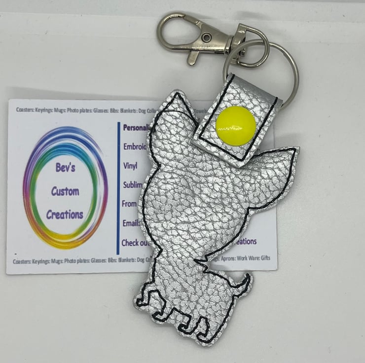 Embroidered Chihuahua in silver keyring.