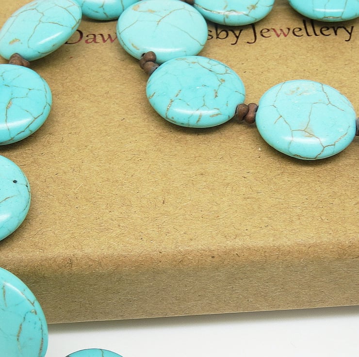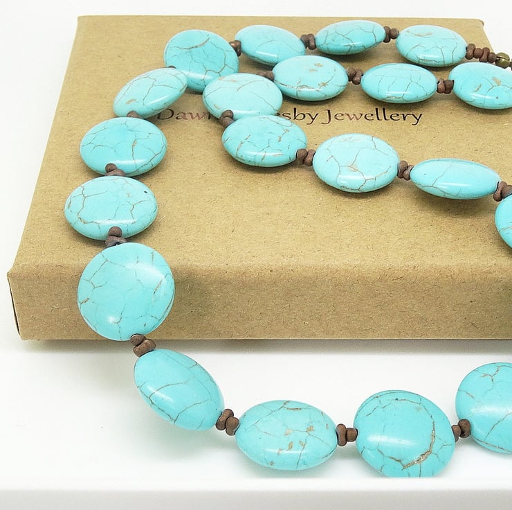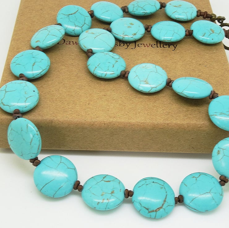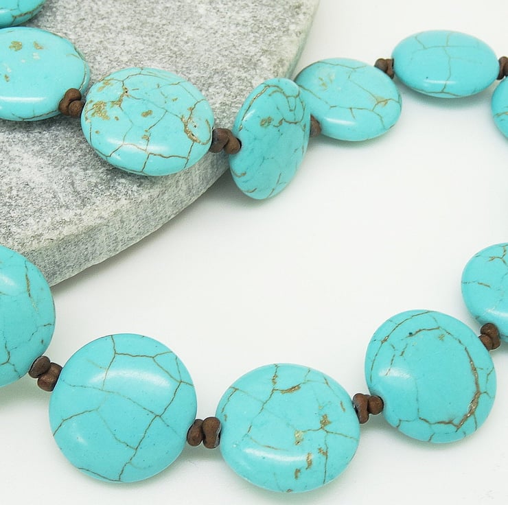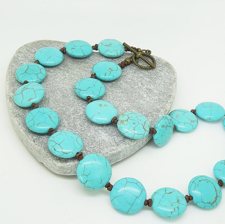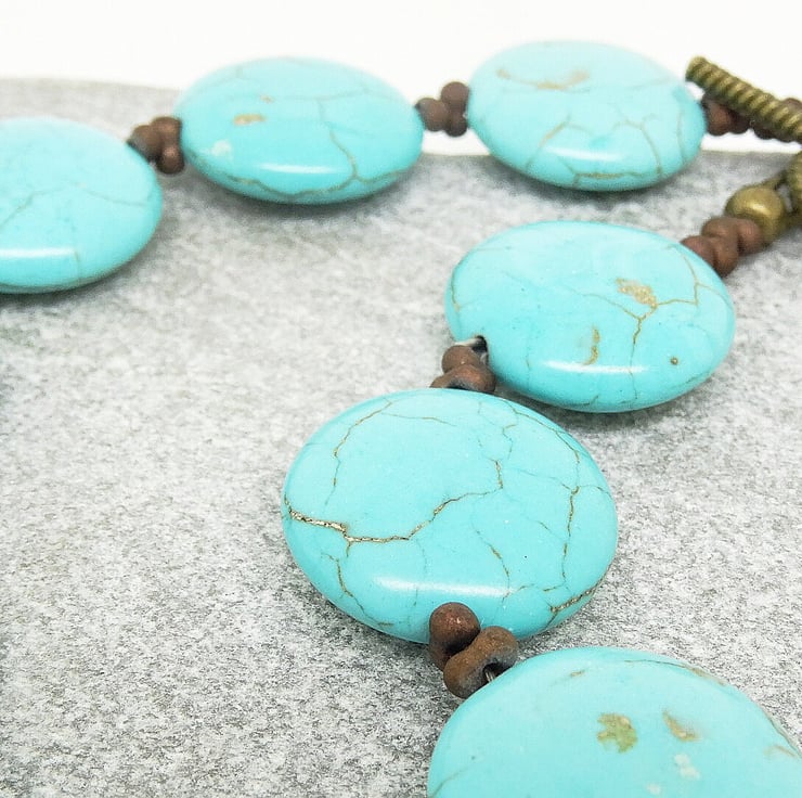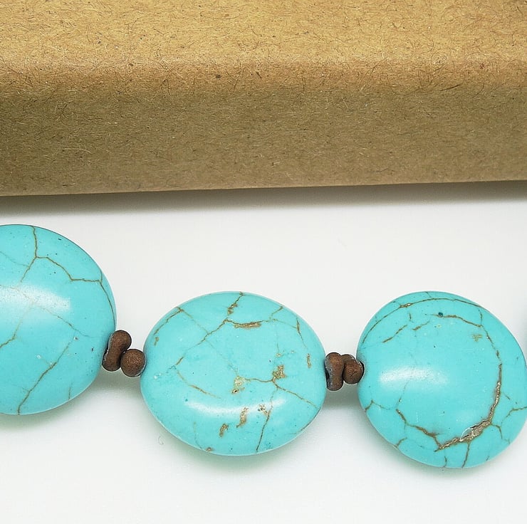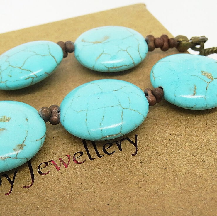 This is a lovely necklace made with reconstituted turquoise beads each measuring 20mm, they are a deep turquoise with pale brown vein like markings. These are interspersed with chocolate brown Czech Glass peanut beads or Farfalle beads (because of their butterfly like shape). The necklace measures 19 inches (48.5cm) and closes with a antique bronze coloured, ribbed finish toggle clasp.