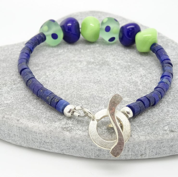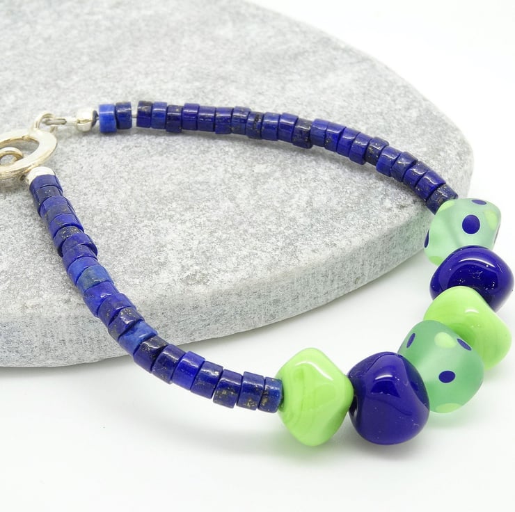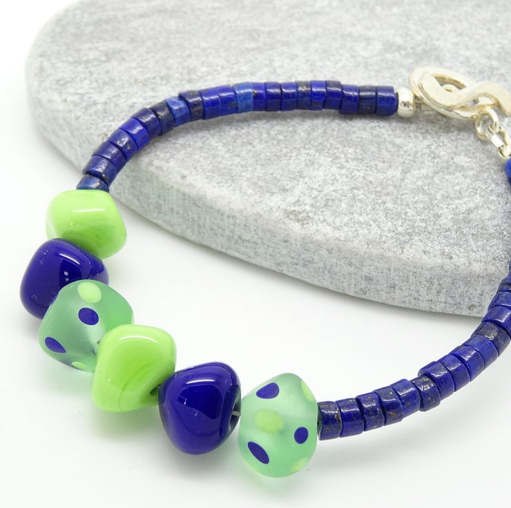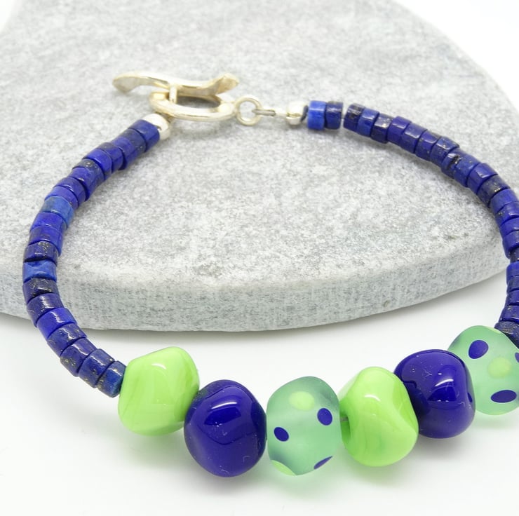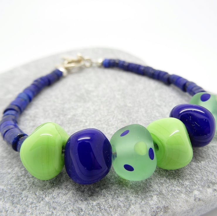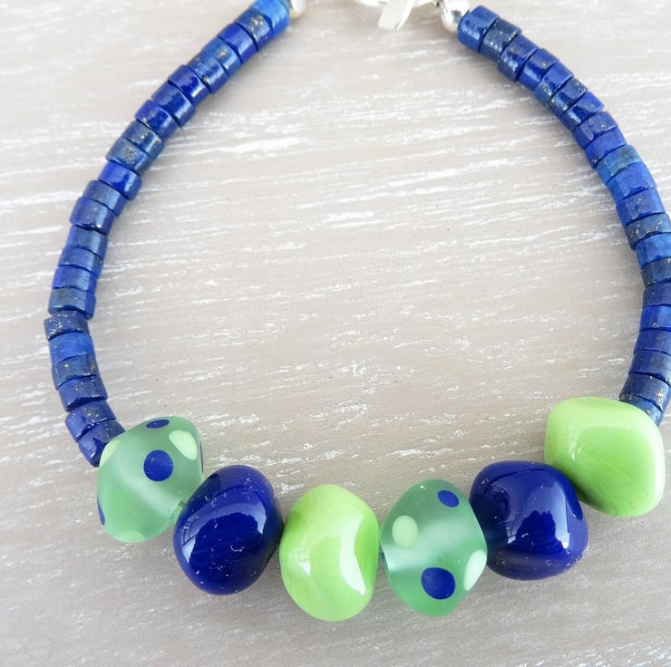 This is a lovely bracelet made using handmade Lampwork Glass Nuggets, there are two shiny navy blue, two shiny apple green and two frosted green and blue dottie nuggets. Beautiful 4mm Lapis Lazuli heishi beads finish the bracelet which measures 8" (20cm) and is fastened with a Karen Hilltribe Silver toggle clasp (Karen Silver is purer than sterling at 999 as opposed to 925 for sterling.