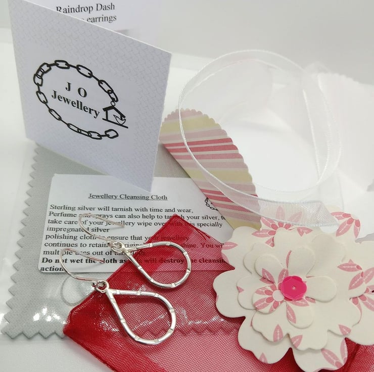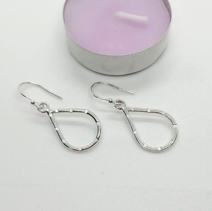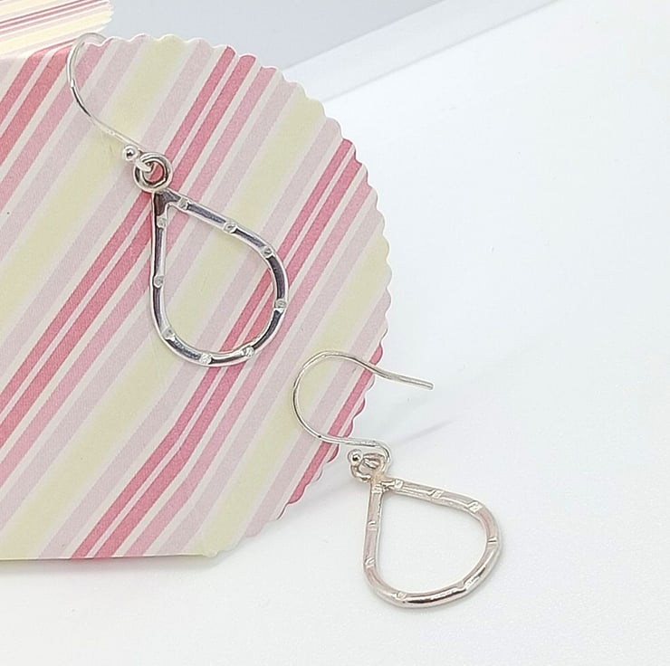 Handmade dashed Texture raindrop earrings in solid sterling silver, the dash decoration is evenly spaced all the way around the outline raindrops, these are suspended on sterling silver earrwires.