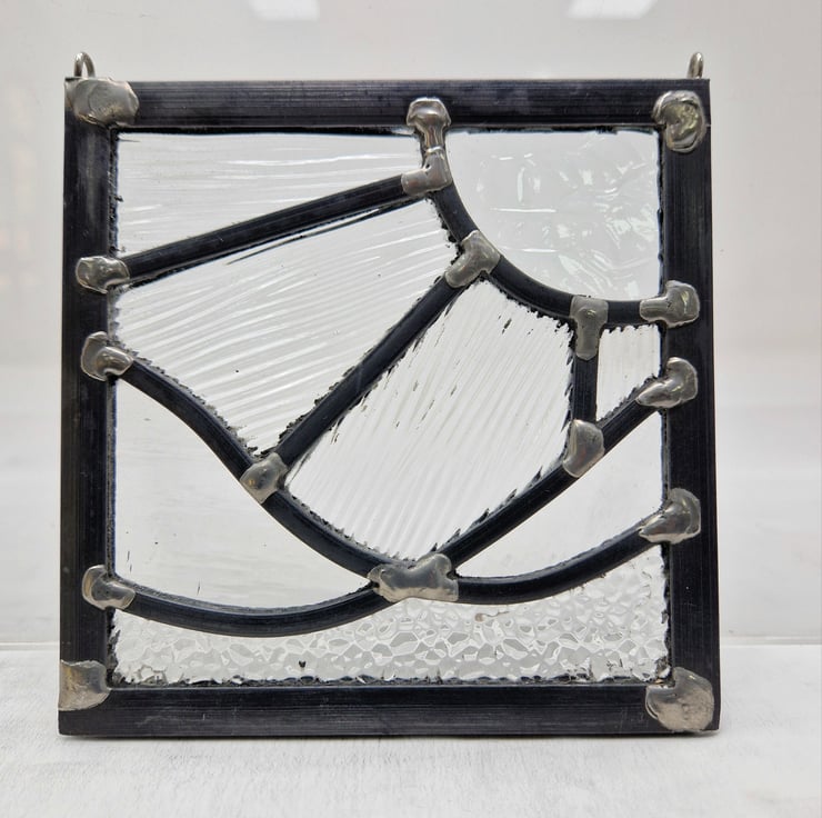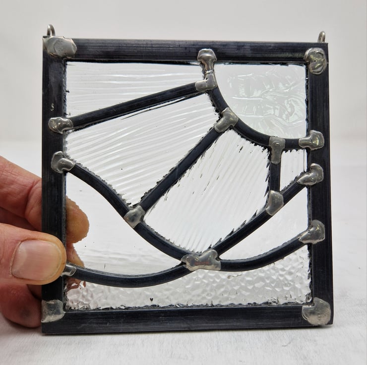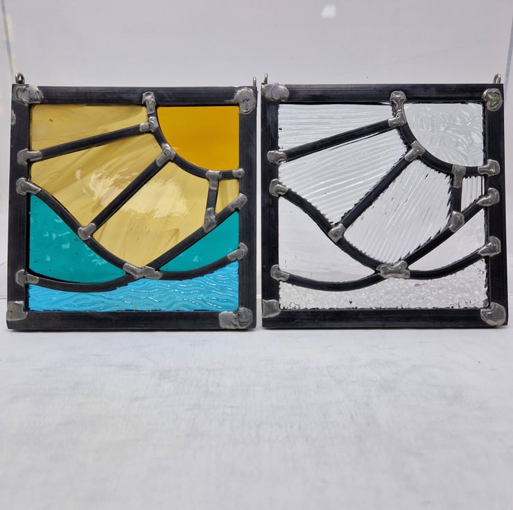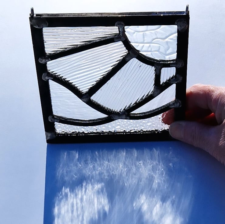 A small square panel made using colourless but heavily textured glass. The image is a sunshine with four rays shining over three ocean waves. Four different textures have been selected to add interest to this piece.