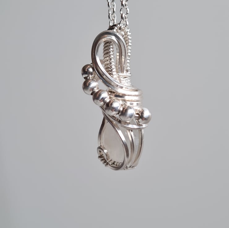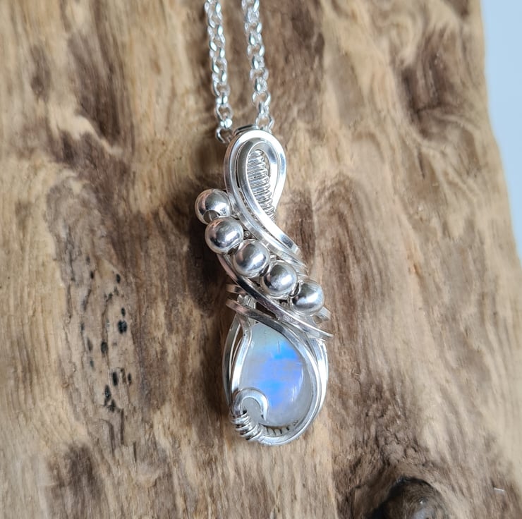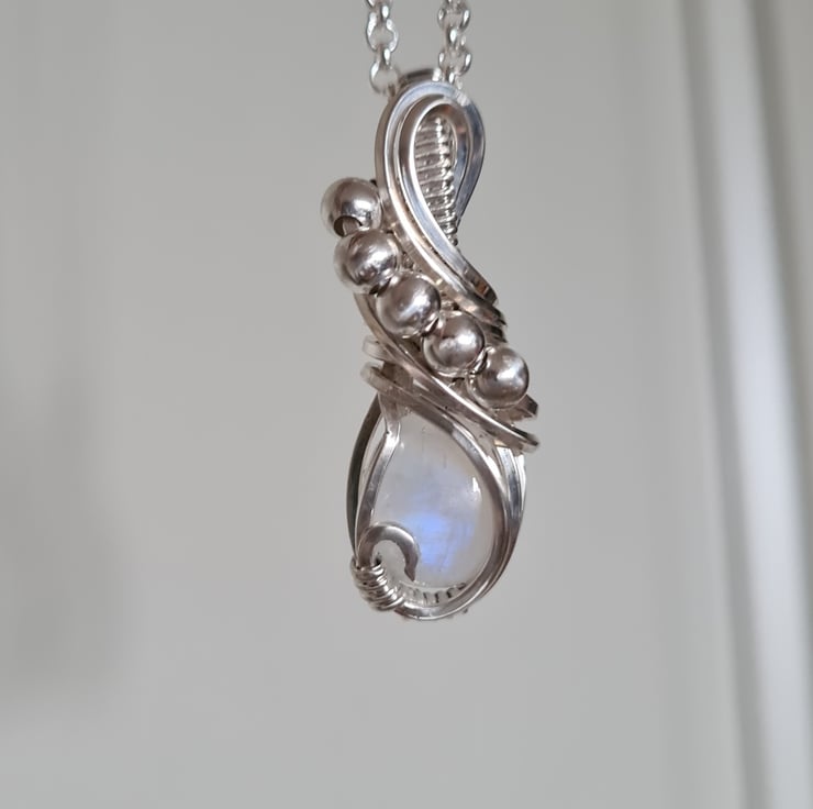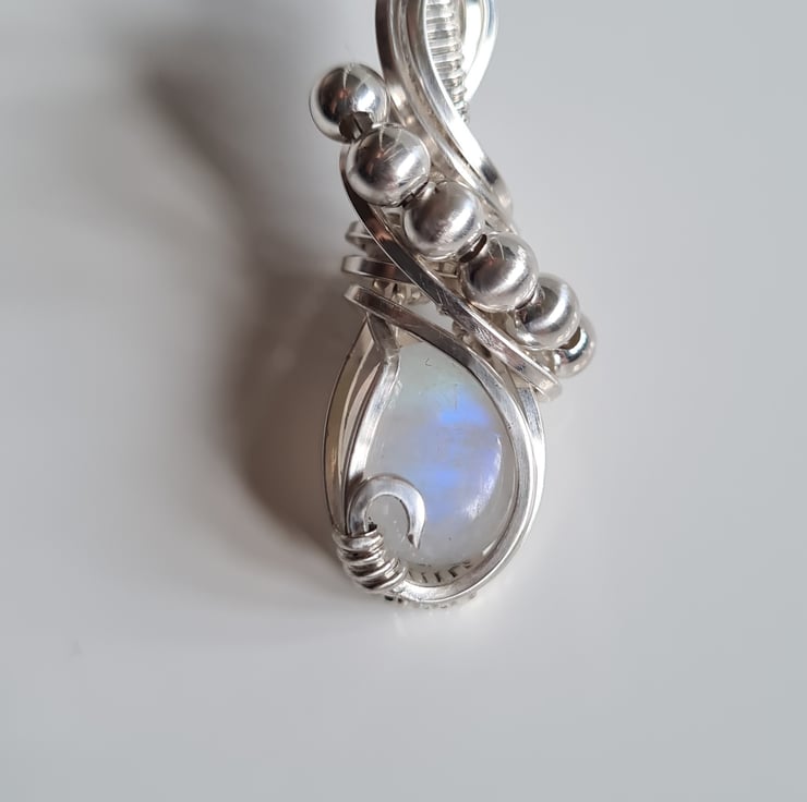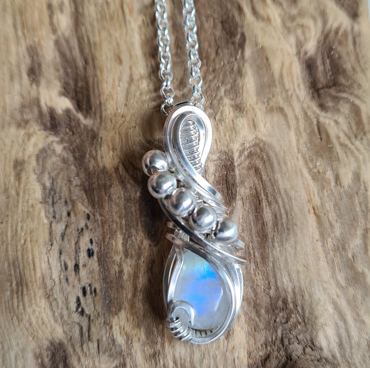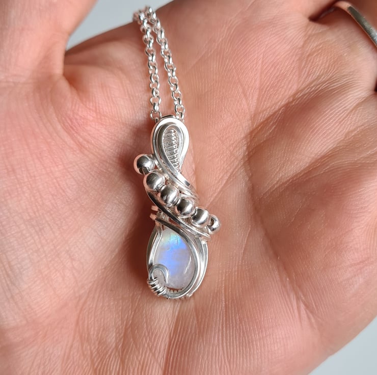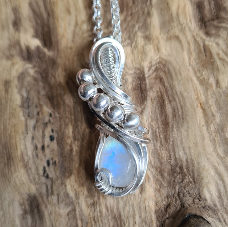 I have handcrafted this elegant necklace using this gorgeous top quality Natural Rainbow moonstone, which I have wrapped entirely in 925 Sterling Silver and finished with Sterling Silver beads. This moonstone has a lovely subtle blue flash and a lovely calming energy to it. You can view full videos of this pendant on my Facebook & Instagram pages.