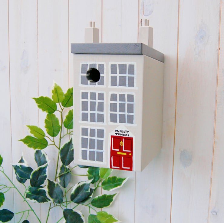 The Georgian house bird box is painted in a stone colour and comes with a vibrant red door. It can be personalised with up to 2 lines of up to 12 characters above the door, making the box even more special.