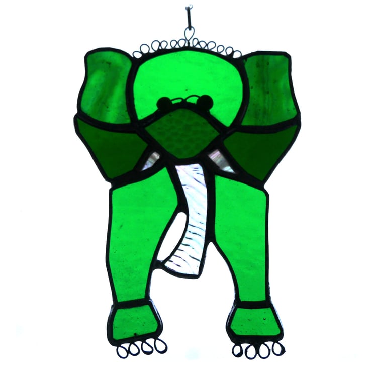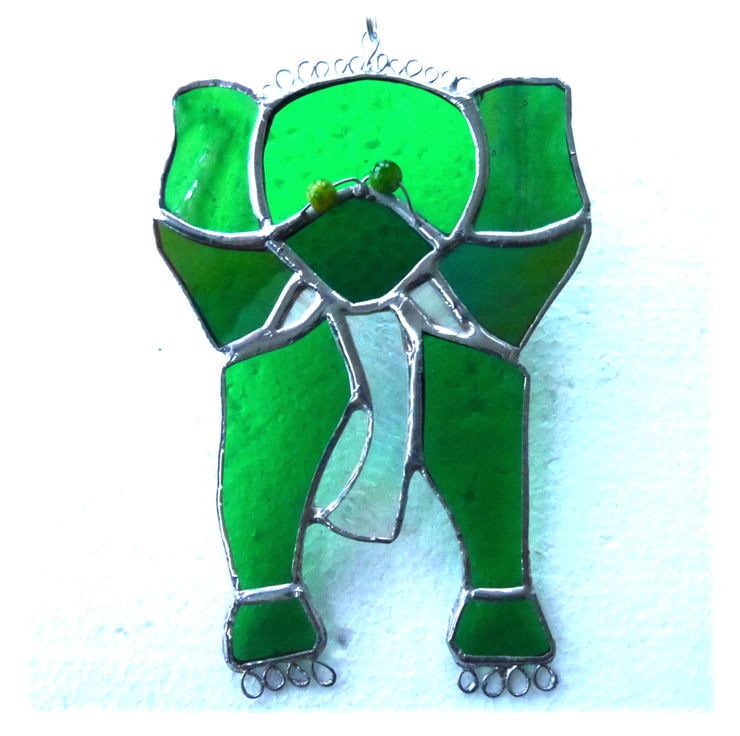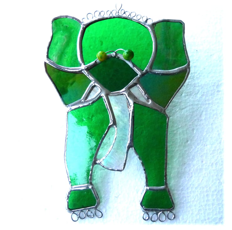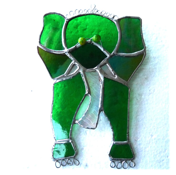 It is an elephant made with lovely bright green glass, Four types of texture and shade. Its trunk is of course wrinkled and its tusks are 'ivory'.