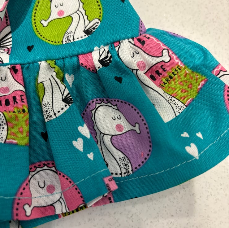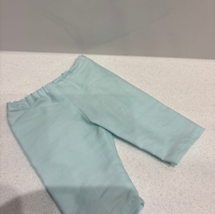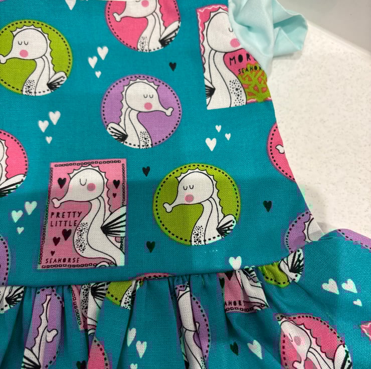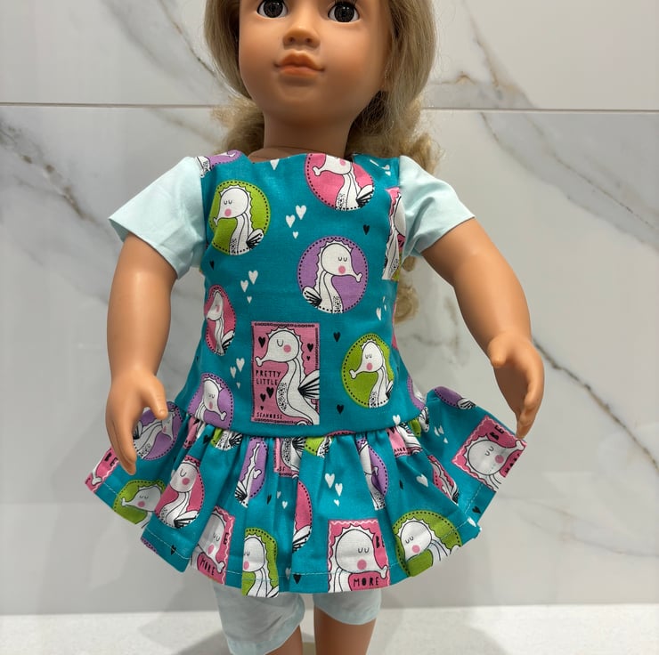 Tunic dress with coordinating cropped style trousers. This outfit is made to fit 18”/46cm dolls. Our Generation Brand. The dress has a pretty seahorse print. The dress is lined. The main colour is a turquoise/green with pink and white. The trousers coordinate perfectly in a pale colour of the green.