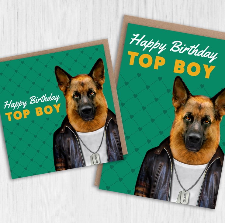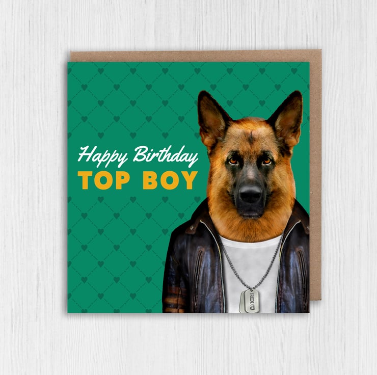 Happy Birthday Top Boy German Shepherd dog, doggy in clothes card for boyfriend, husband, male, brother (Animalyser) Size A6/A5/A4/Square