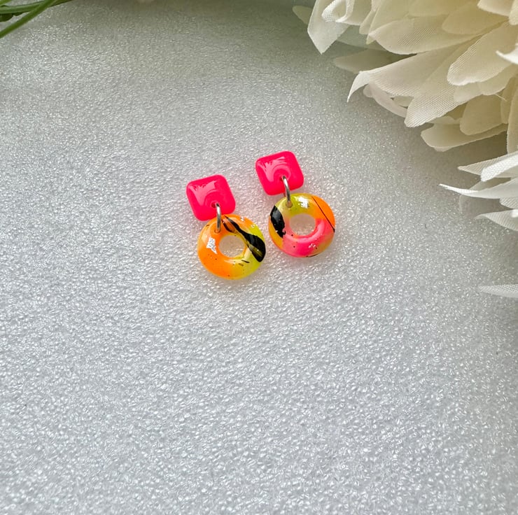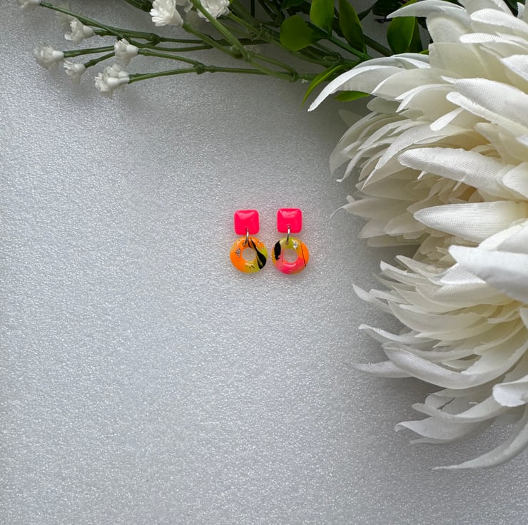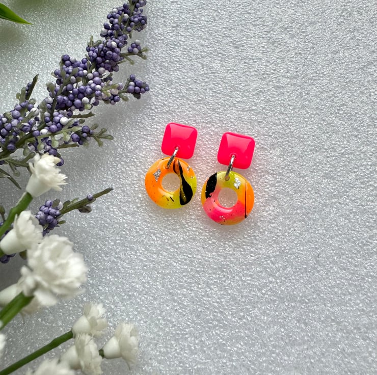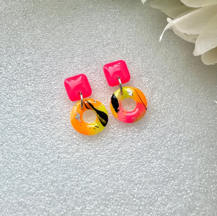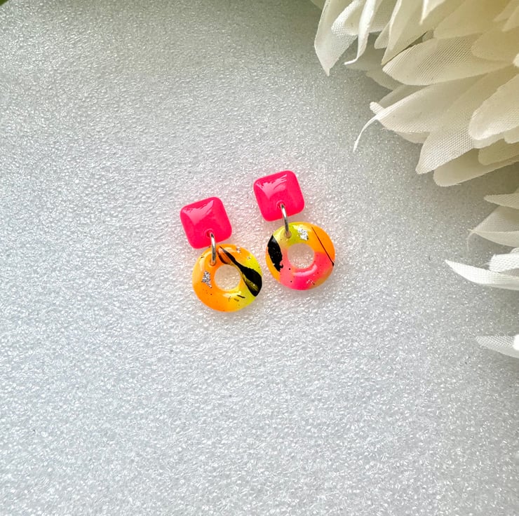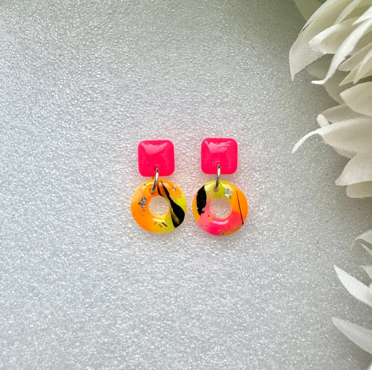 Pink, orange, yellow with a splatter of paint and a dab of silver leaf