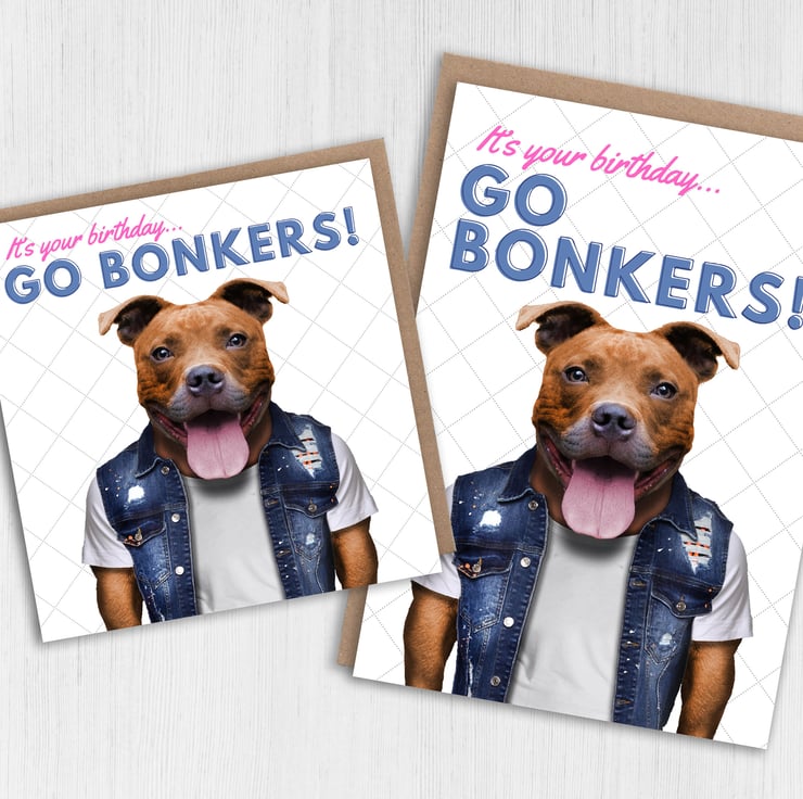 It's your birthday, go bonkers Staffy Staffordshire Bull Terrier dog, pet cute, funny birthday card (Animalyser) Size A6/A5/A4/Square
