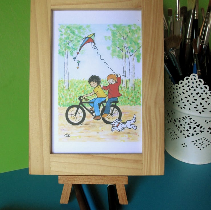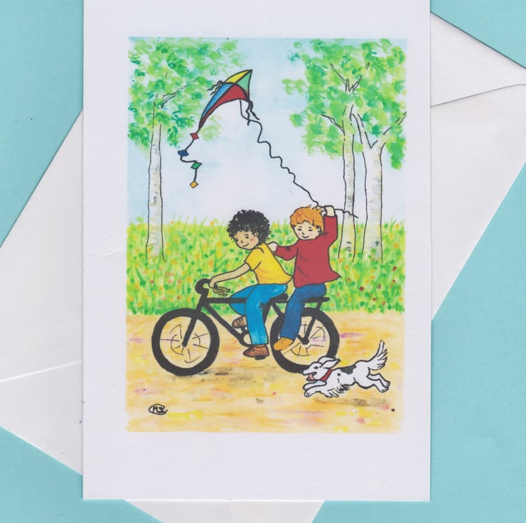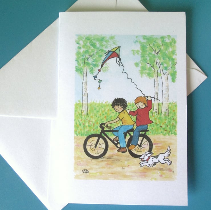 Boys on a bike flying their kite. Lovely card for a boy's birthday.