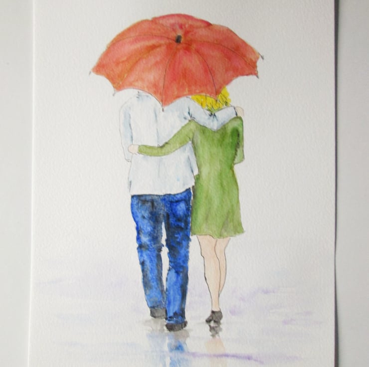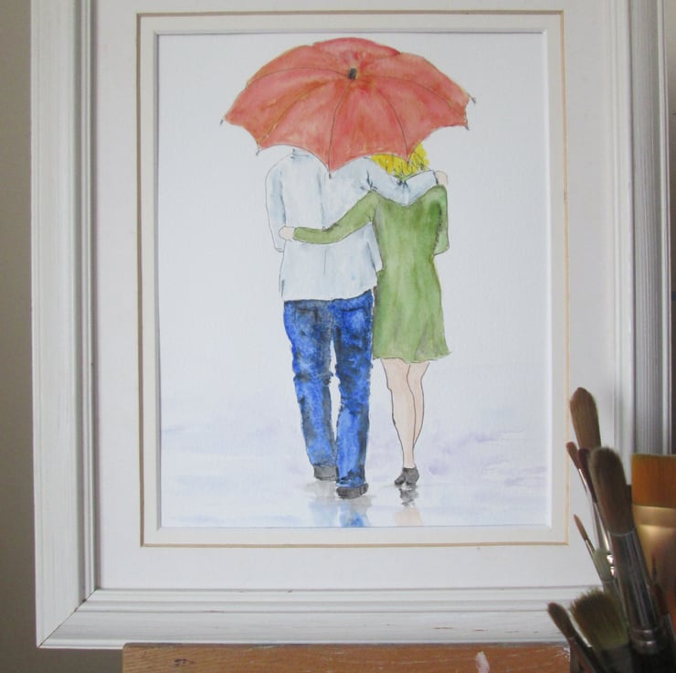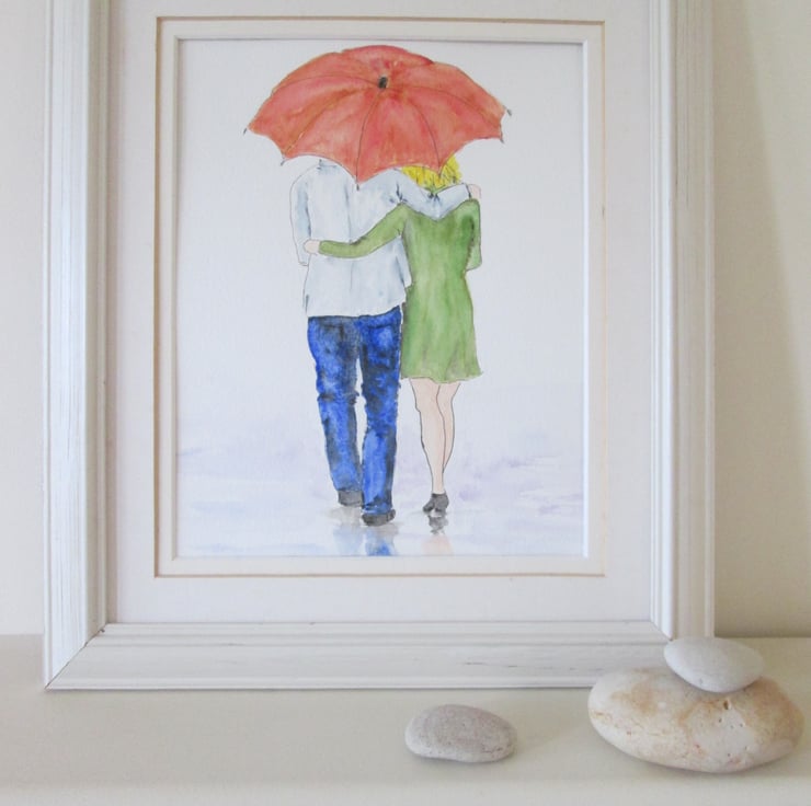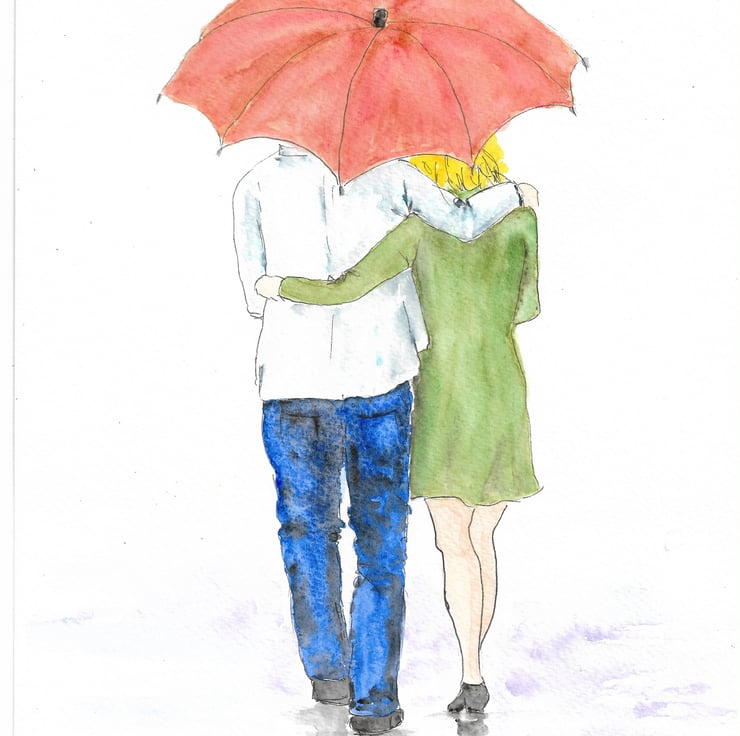 A loose original watercolour painting of a couple walking closely together. This shows the love and care they have for each other.