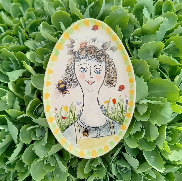 Handmade in white clay.Drawn and painted with coloured slips and glazed in a transparent glaze.Ceramic decals of birds flowers and insects are fired on to add detail. Measures approximately 14cms by 9cms
