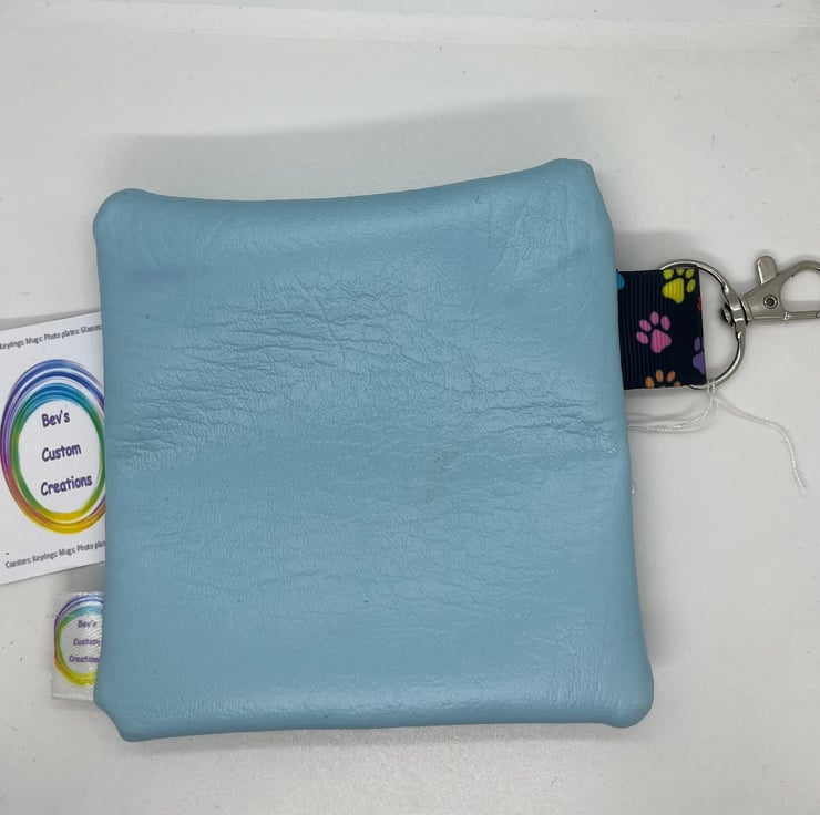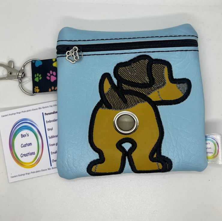 Handmade, embroidered small bag to fit a roll of poo bags, clips onto your dog’s harness, some leads or your belt strap. Bags dispenses through the hole place on the dogs bum.