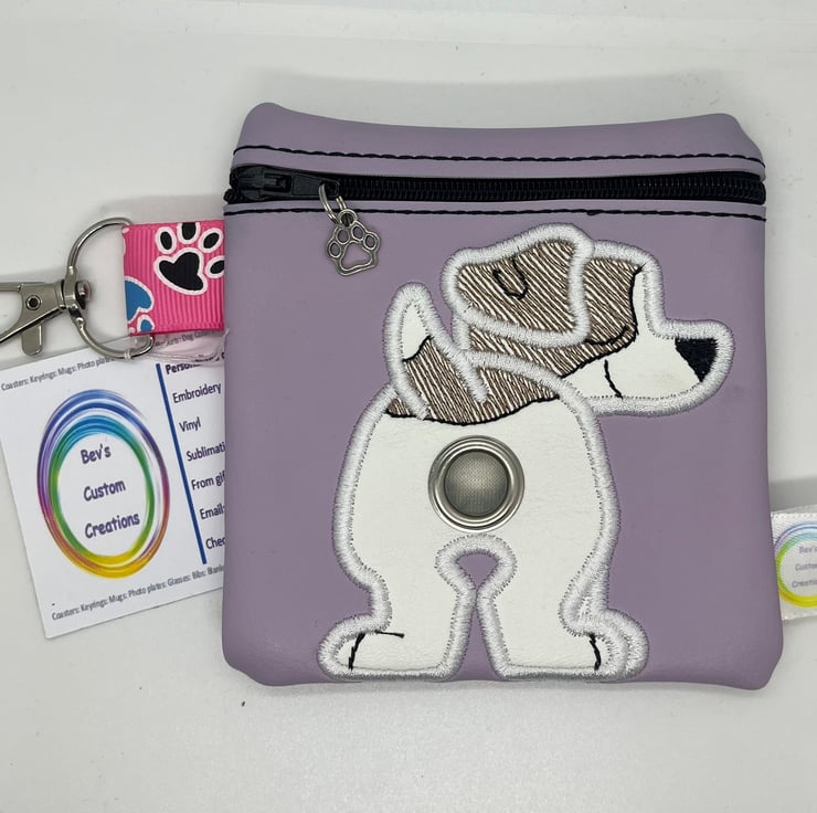 Handmade, embroidered small bag to fit a roll of poo bags, clips onto your dog’s harness, some leads or your belt strap. Bags dispenses through the hole place on the dogs bum.