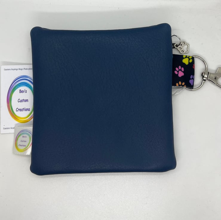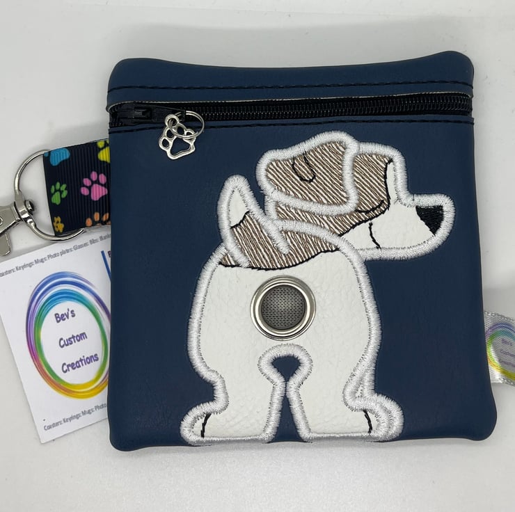 Handmade, embroidered small bag to fit a roll of poo bags, clips onto your dog’s harness, some leads or your belt strap. Bags dispenses through the hole place on the dogs bum.