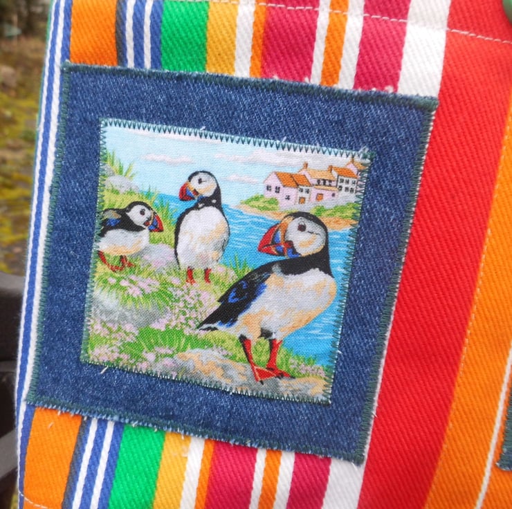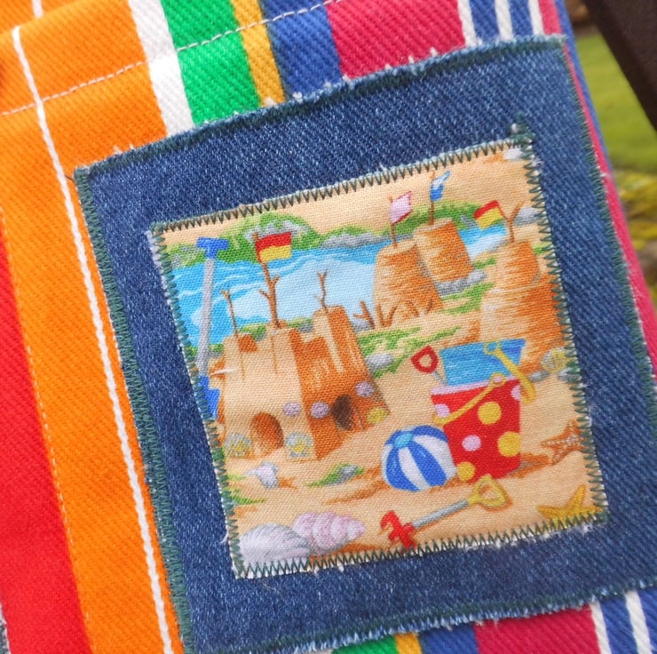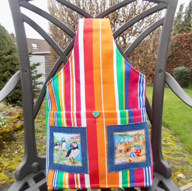 The bottom of the bag has been boxed at the corners so that it has a flat base. Across the front is a divided pocket, appliquéd with patches showing cure puffins and sandcastles. Pocket is lined, it is about 16cm deep and finished with a pink and green wooden heart-shaped button.