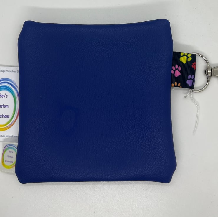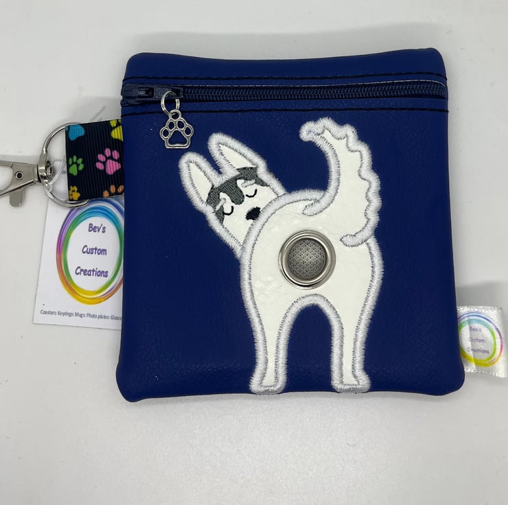 Handmade, embroidered small bag to fit a roll of poo bags, clips onto your dog’s harness, some leads or your belt strap. Bags dispenses through the hole place on the dogs bum.