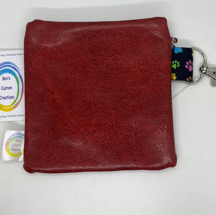 Handmade, embroidered small bag to fit a roll of poo bags, clips onto your dog’s harness, some leads or your belt strap. Bags dispenses through the hole place on the dogs bum.