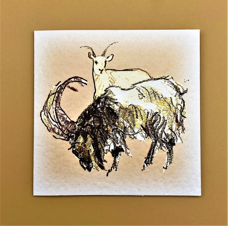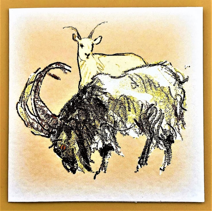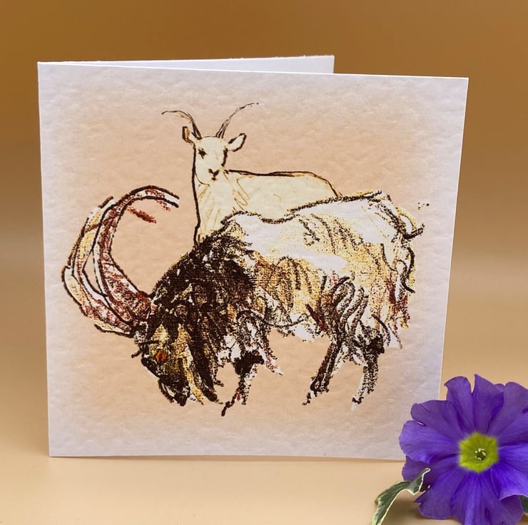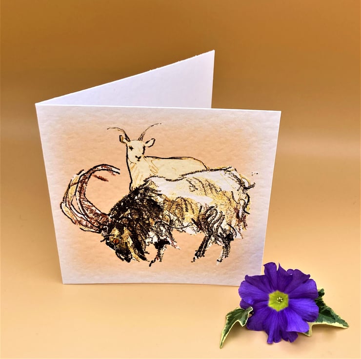 This greetings card of a Billy and Nanny goat is blank for your own message. Taken from one of my sketches of farm animals the card shows a colourful Billy goat with a Nanny goat in the background, the pale pink background brings out the subtle colours of the Billy Goats shaggy coat. A nice agricultural card for rural farm animal and goat enthusiasts.