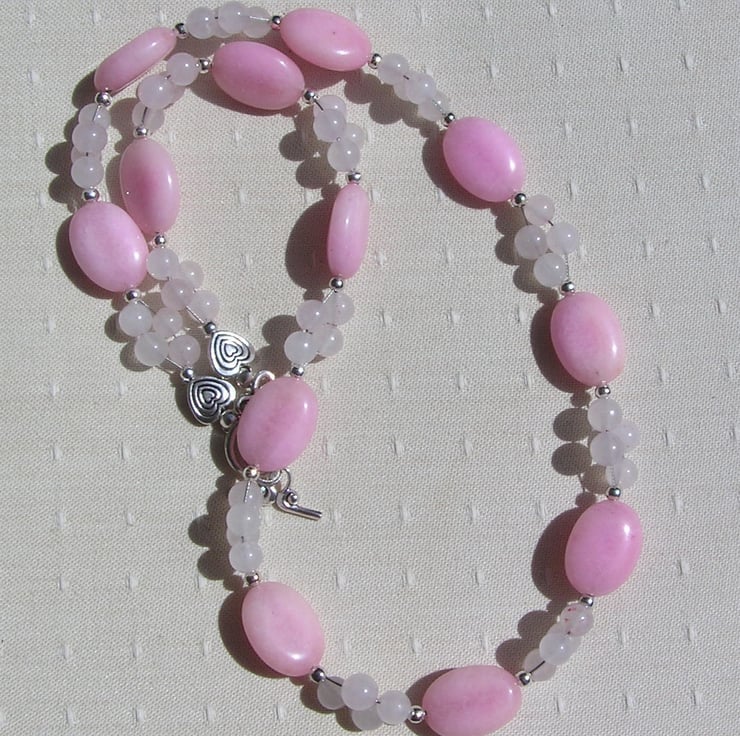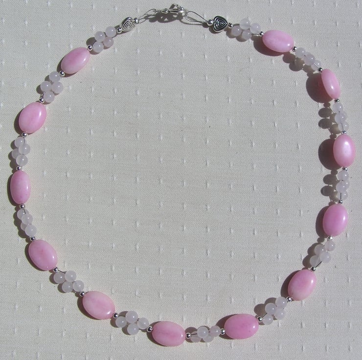 This Stunning Necklace is made is made wholly from Rose Quartz in two contrasting shades... Toffee Pink Oval shaped Beads separated by paler Pink small round beads clustered together in four's - a Beautiful gentle combination that will look stunning either worn casually or with something more Elegant for a Special Evening out