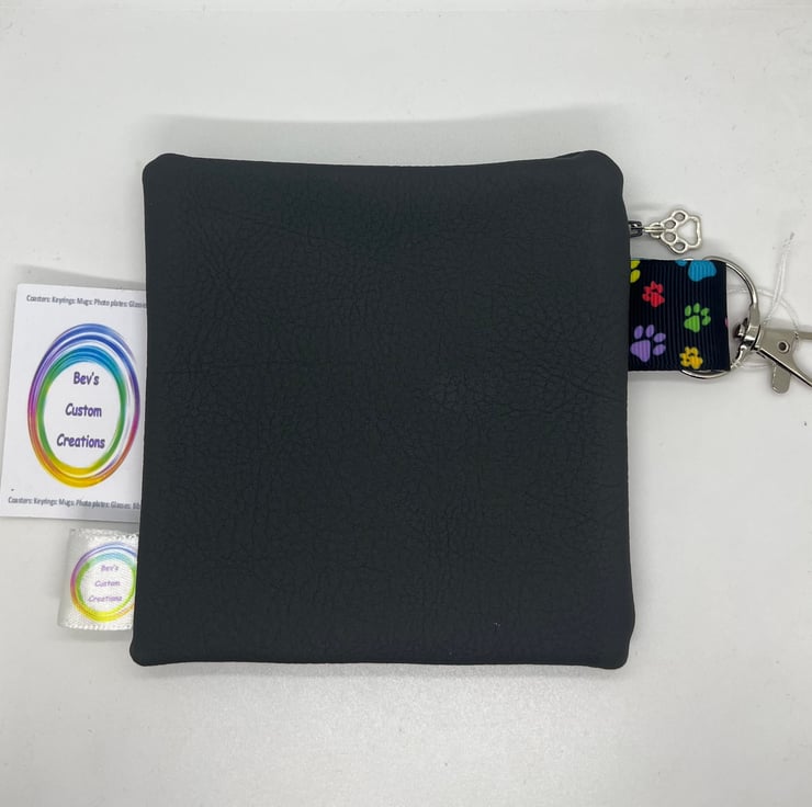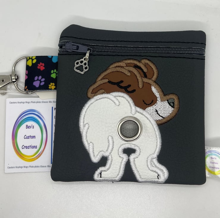Handmade, embroidered small bag to fit a roll of poo bags, clips onto your dog’s harness, some leads or your belt strap. Bags dispenses through the hole place on the dogs bum.