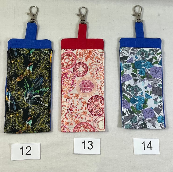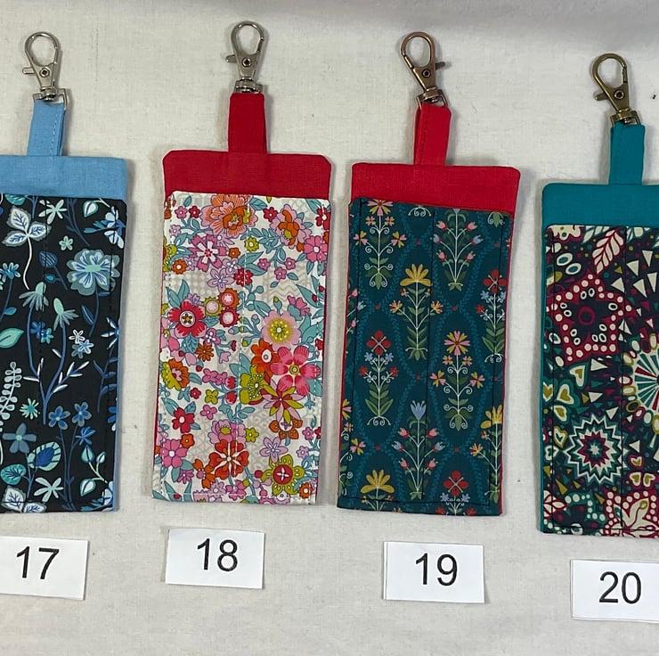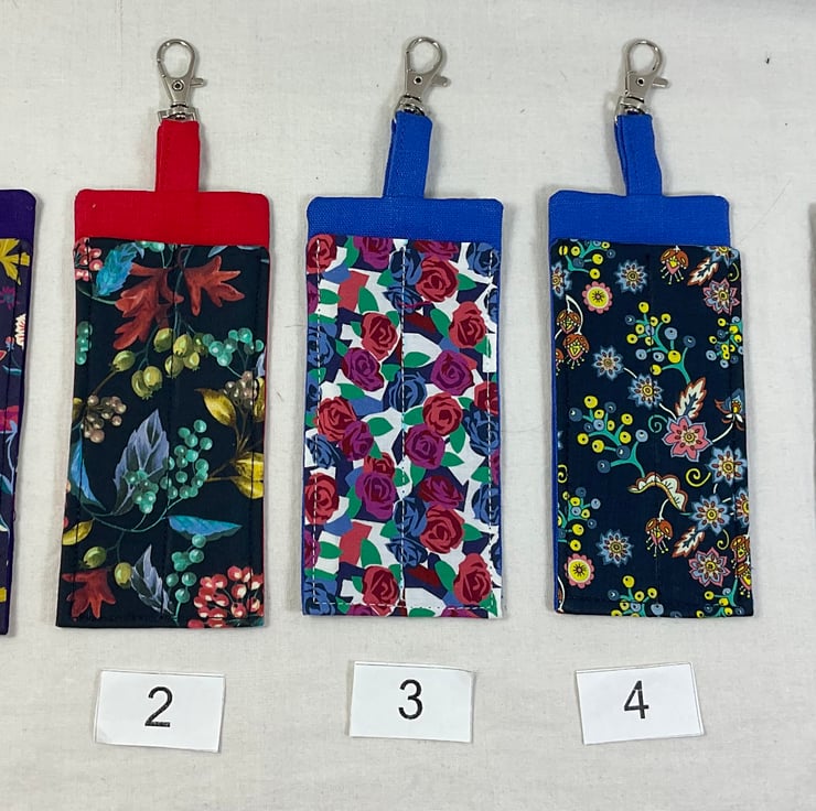 The little cases are made in cotton fabrics and are interfaced for rigidity. The lanyard clip is attached by a fabric matched loop. Pattern placement may vary.