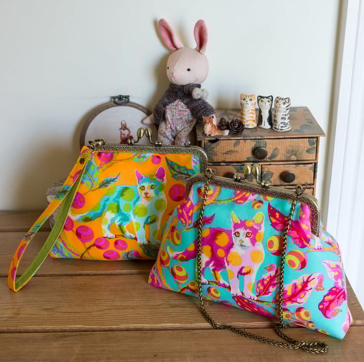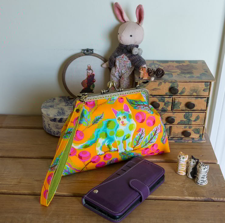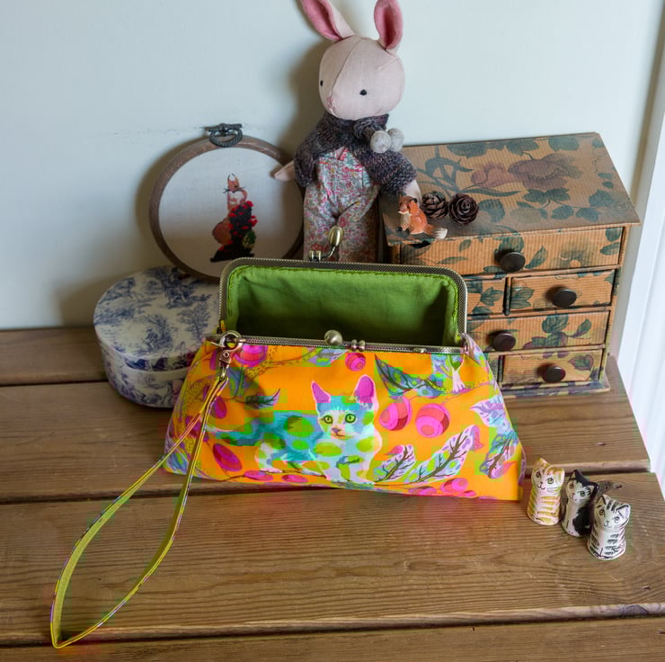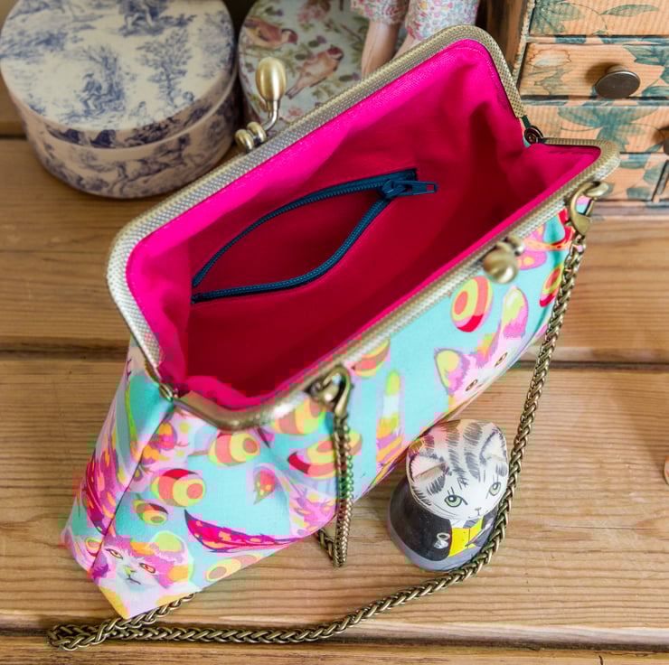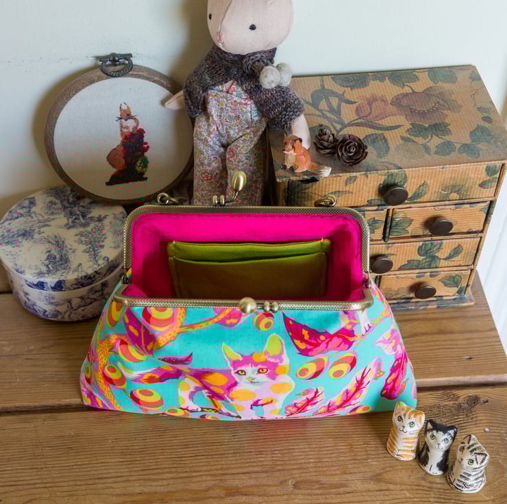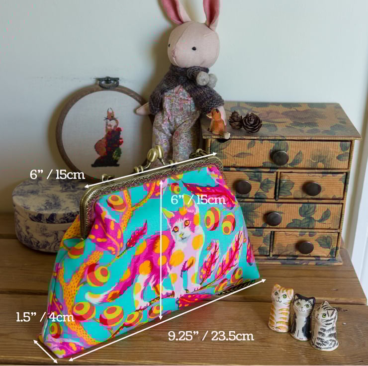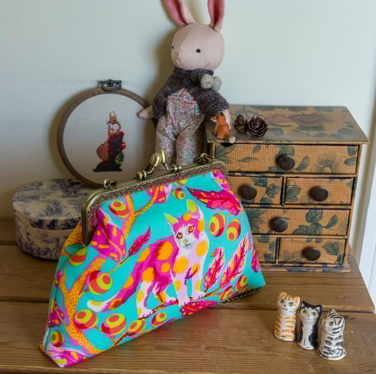 This bag is made with Tula Pink's Disco Kitty fabric on the outer and Essex Linen lining on the inside. I interface both inner and outer with woven cotton interfacing and then add a layer of fleece for body, softness and protection for the contents. The engraved metal frame of the bag is an antique bronze colour with 2 attachment points on the top for a strap, which I hand stitch into place with toning perle cotton thread.