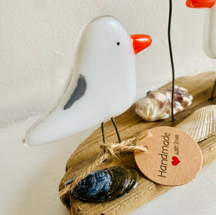 The 2 glass seagulls comes on its own unique piece of driftwood which to me looks like a bridge I then added a fused glass love heart balloon on a wire .