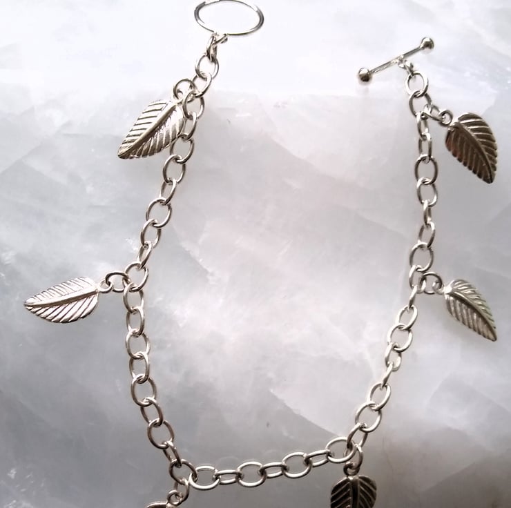 A classic charm bracelet of 925 sterling silver cable link chain with six ornate, double sided leaf charms to gently sway on the wearers wrist. Finished with an easy to use toggle clasp.