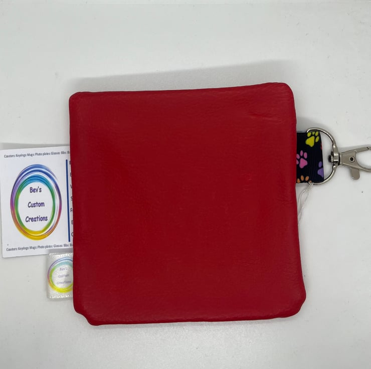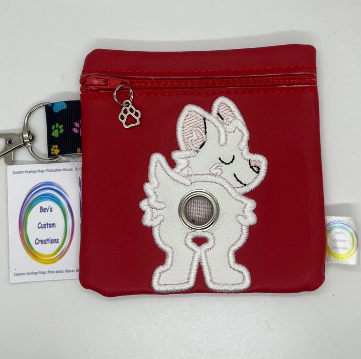 Handmade, embroidered small bag to fit a roll of poo bags, clips onto your dog’s harness, some leads or your belt strap. Bags dispenses through the hole place on the dogs bum.