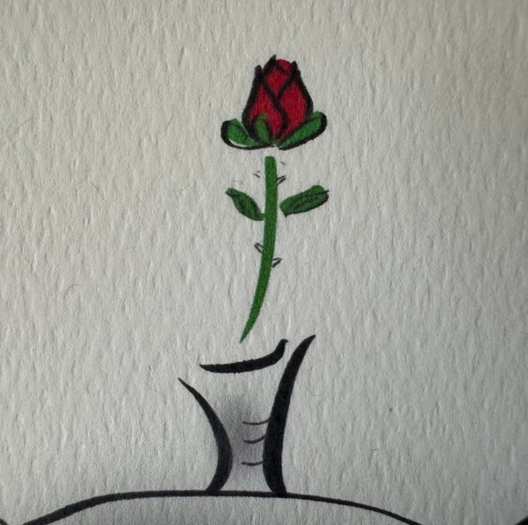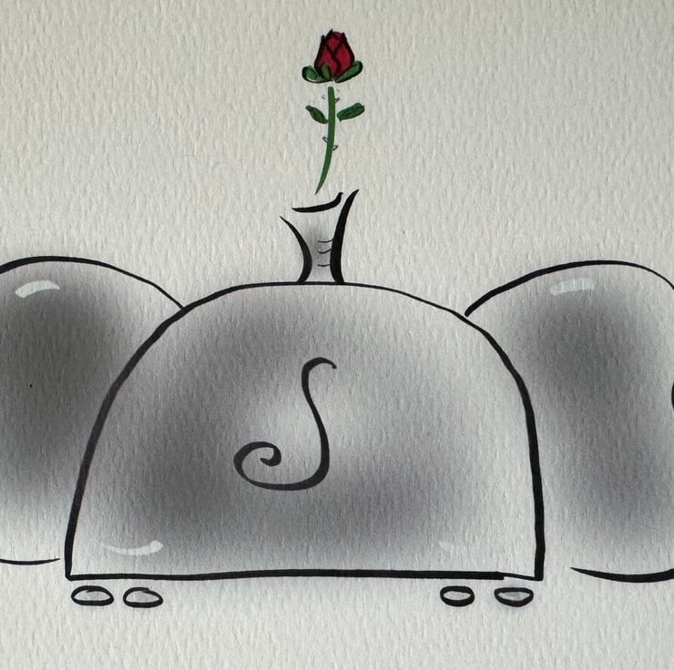 A hand drawn card featuring a cute elephant holding a rose which is the birthday flower for June.