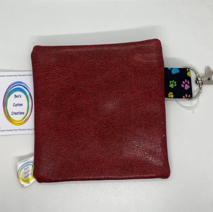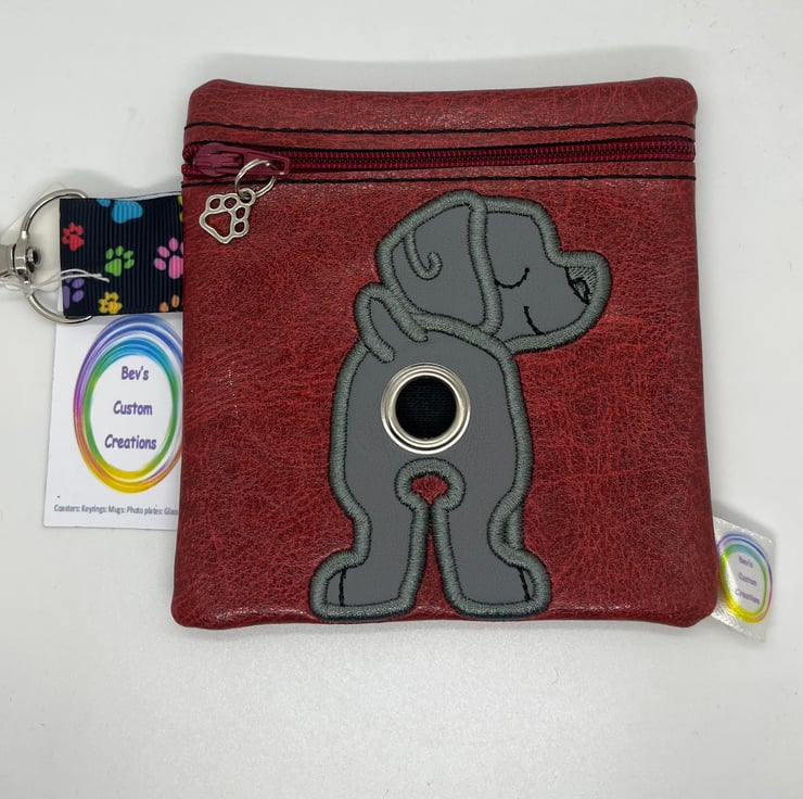 Handmade, embroidered small bag to fit a roll of poo bags, clips onto your dog’s harness, some leads or your belt strap. Bags dispenses through the hole place on the dogs bum.