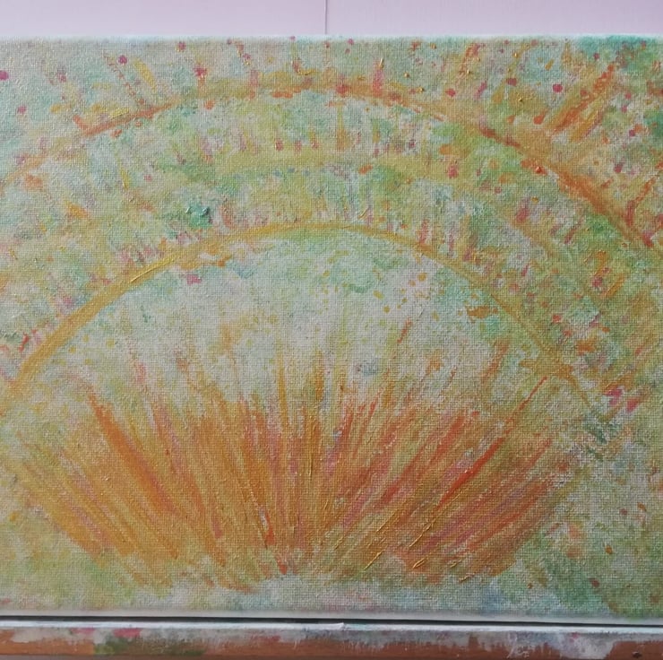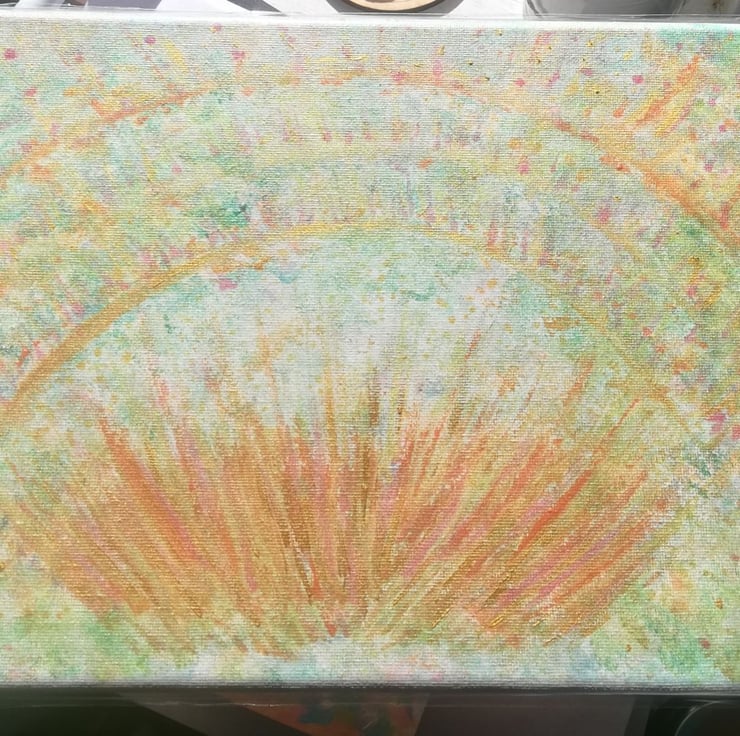 I'd been to the beach and I was looking at shells. I wanted to paint a shell-like picture, also I wanted to infuse the painting with the vibrancy of nature and the sheer joy of it. I used a speckle like effect to create the basis of a forest like setting and used the gold and orange to try to express the vibrant and yet softness of nature.