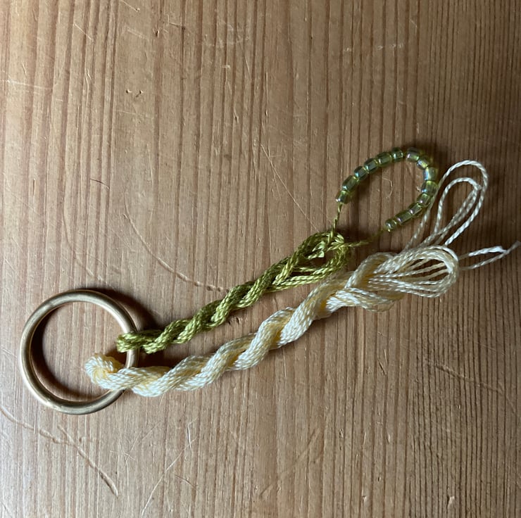 cotton thread in a main colour and in a contrasting shade that has been pre-threaded with glass beads,