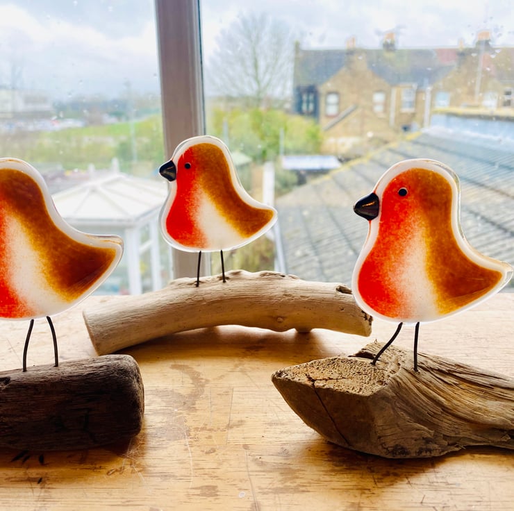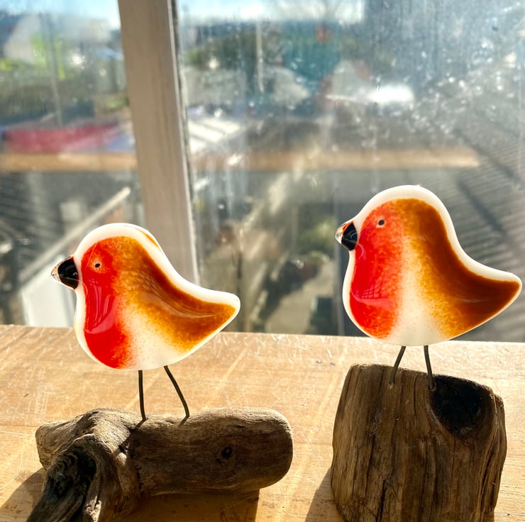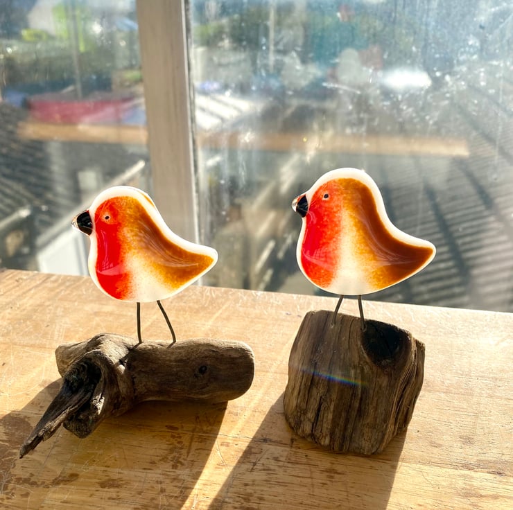 One unique fused glass bird Robin ornament on a wooden driftwood stand made by Faiths Art Glass