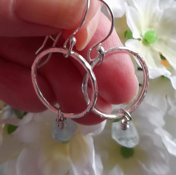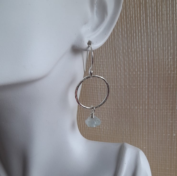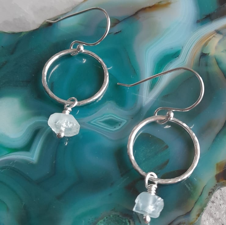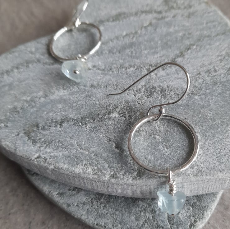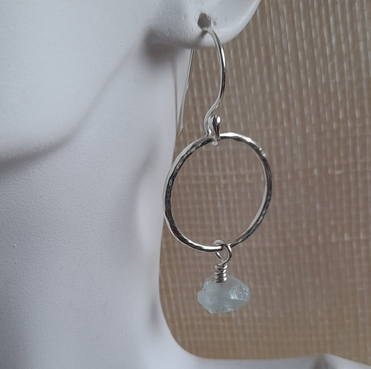 These hoop earrings have been handmade out of argentium silver wire which has been formed into a round shape and soldered to form a circle, hammered to give texture and then having small rough cut nuggets of aquamarine suspended from the hoops