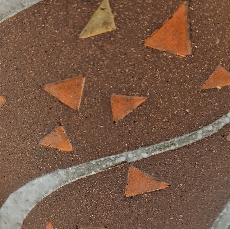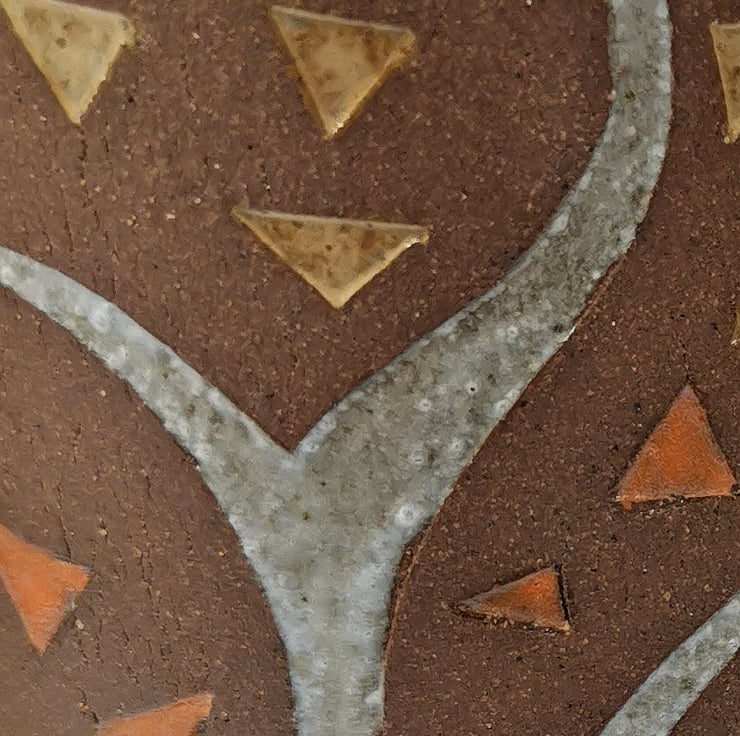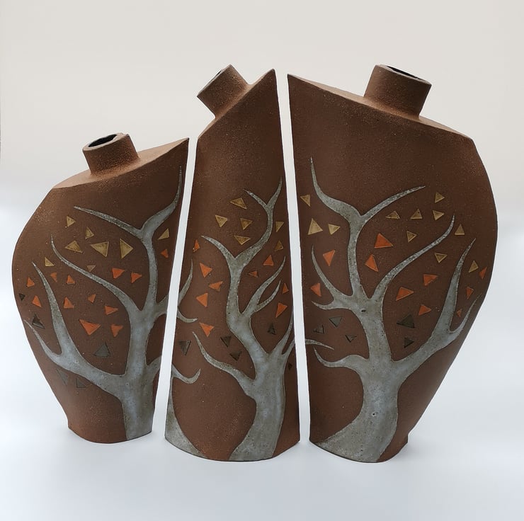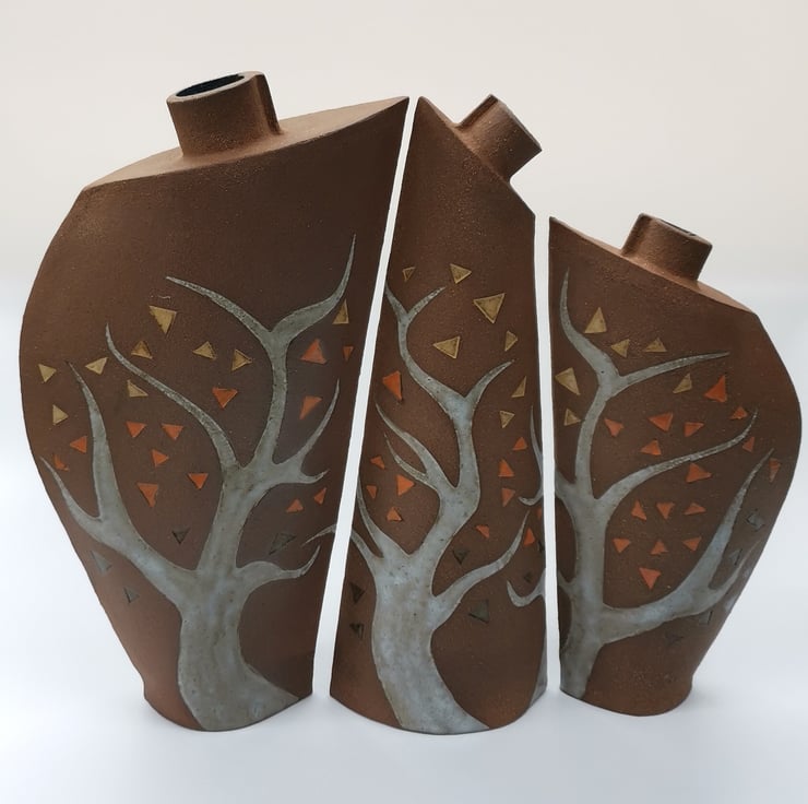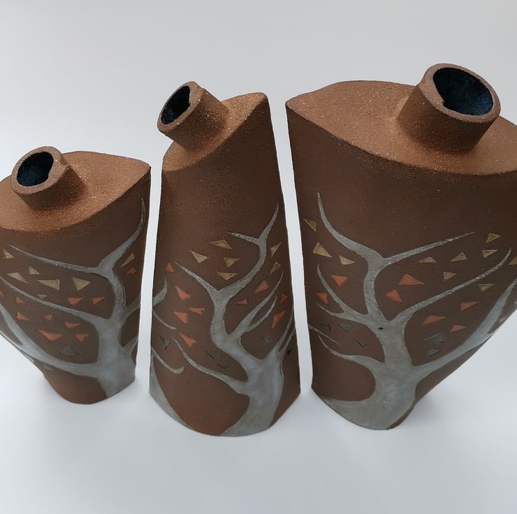 These trio of vases are slab built from dark crank clay with trees and leaves imprinted using hand drawn templates. They are decorated with under-glaze and finished with a variety of glaze colours. Sections of the clay have been left unglazed to give a contrast to the tree and leaf decoration, and to show off the beauty and warmth of stoneware clay in its natural fired state. When displayed as a trio the vases link to form a continuous ‘woodland’.