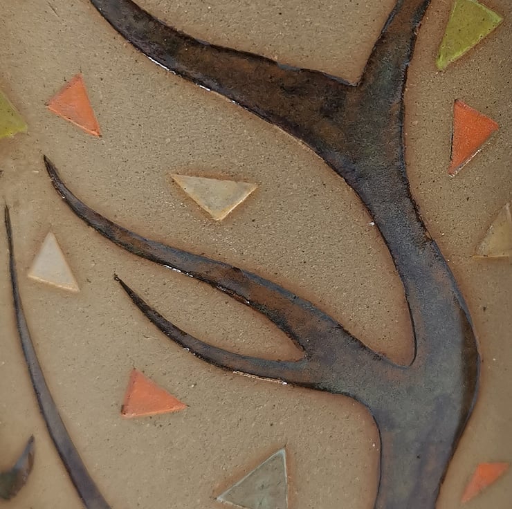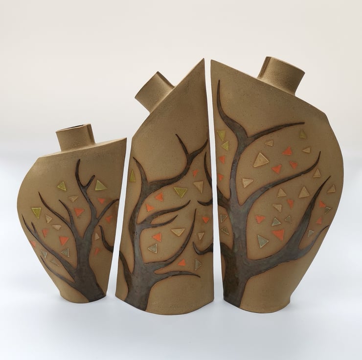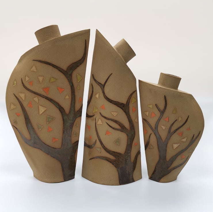 These trio of vases are slab built from buff clay with trees and leaves imprinted using hand drawn templates. They are decorated with under-glaze and finished with a variety of glaze colours. Sections of the clay have been left unglazed to give a contrast to the tree and leaf decoration, and to show off the beauty and warmth of stoneware clay in its natural fired state. When displayed as a trio the vases link to form a continuous ‘woodland’.