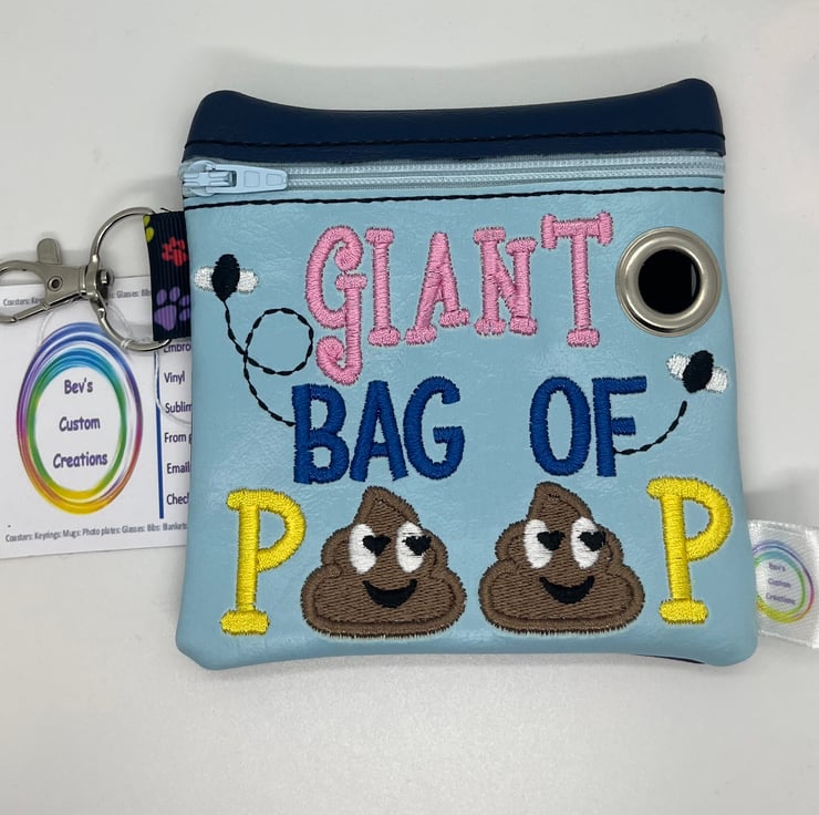 Embroidered Giant Bag Of Poop poo bag dispenser. this is a multi coloured bag with the front panel light blue, the top front a dark blue and the back is dark blue. Making this bag a one off quirky bag.