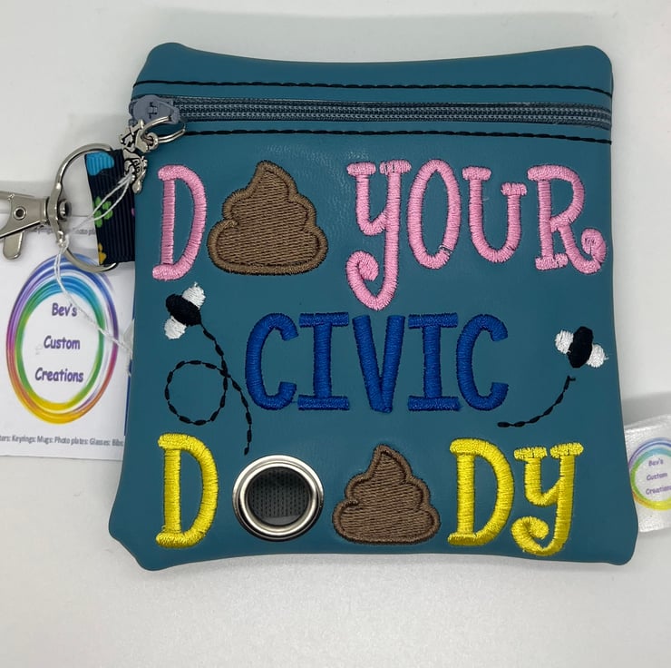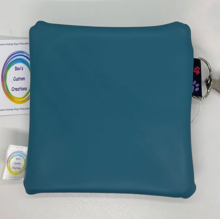 Handmade, embroidered small bag to fit a roll of poo bags, clips onto your dog’s harness, some leads or your belt strap. Bags dispenses through the hole on the bag.