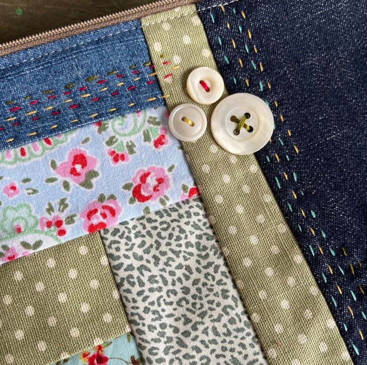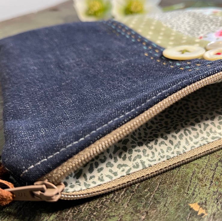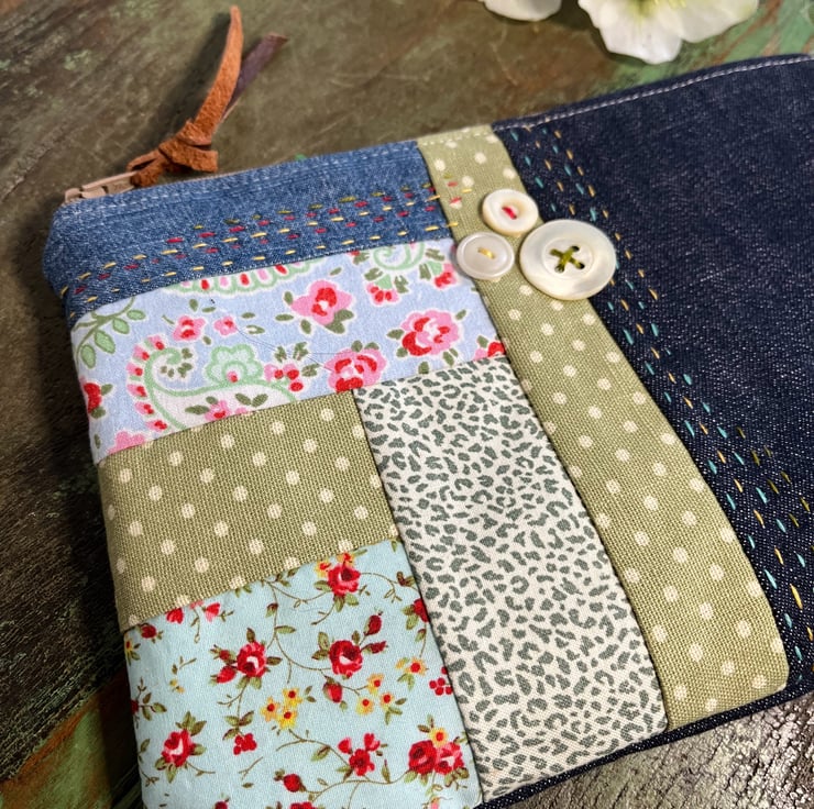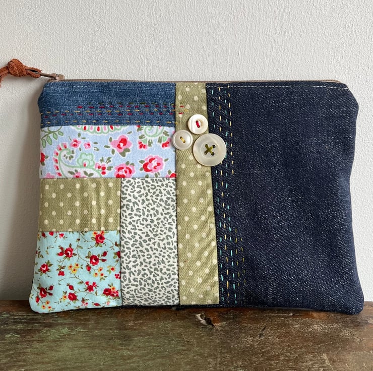One of a kind medium zip pouch made from a patchwork of pretty fabric scraps, with embroidery and pearly button decoration. The patchwork is backed with lightweight denim from a sample swatch and the pouch is fully lined with mini leopard print cotton. A strip of waste leather from a local upholsterer makes a durable zip pull.