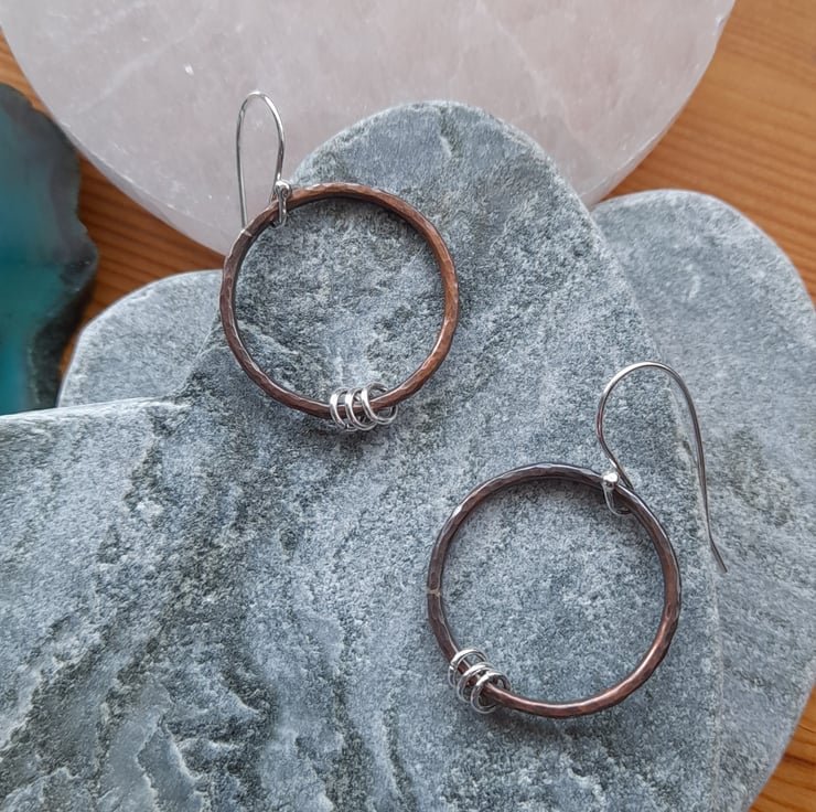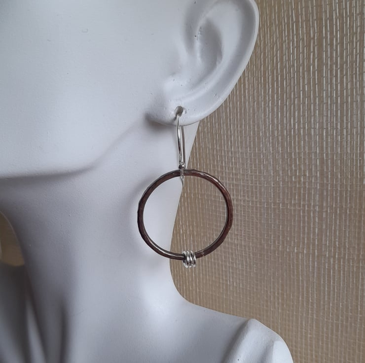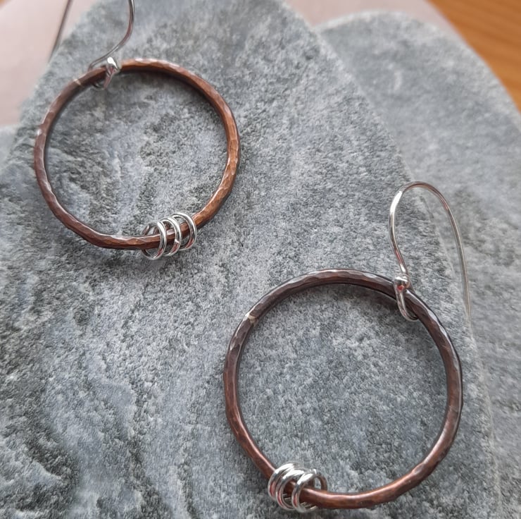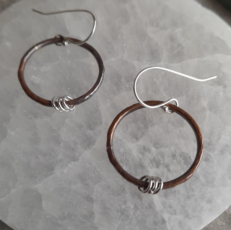 These earrings have been made out of copper wire which has been formed into a circle soldered and hammered to give texture and harden the wire. The hoops have then been oxidised to give an aged look .The copper hoops have been attached to sterling silver ear wires. There are some small sterling silver jump rings added to the hoops All metals used are copper and sterling silver
