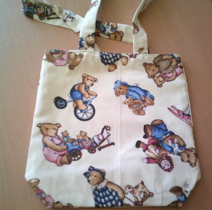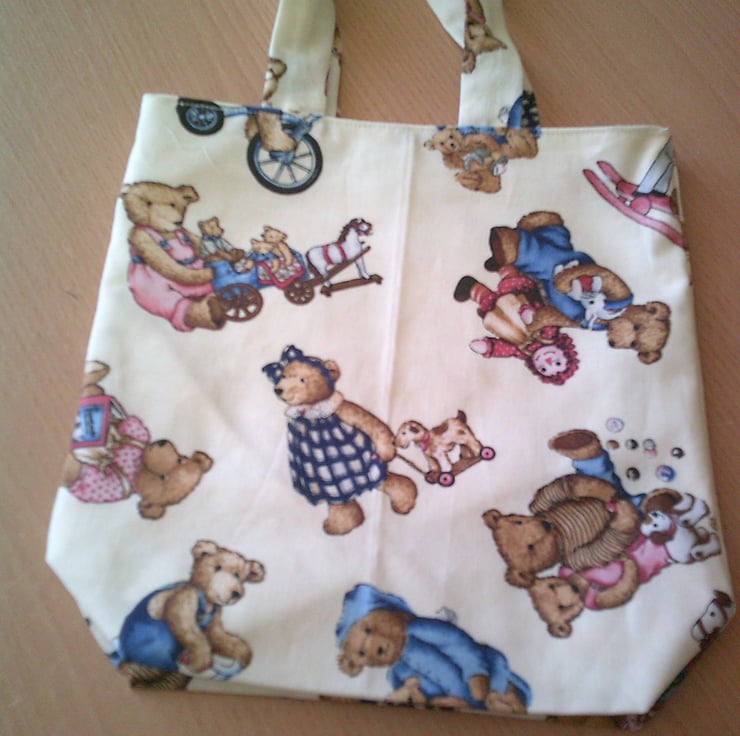 The fabric used has a design featuring teddy bears playing with a variety of toys including rabbits, rag dolls, rocking horses and bicycles on a cream background.