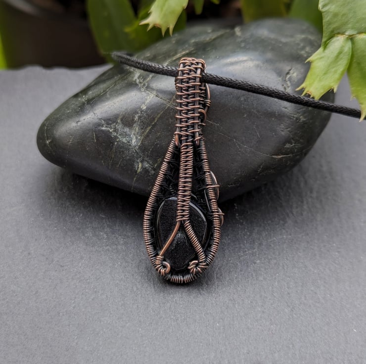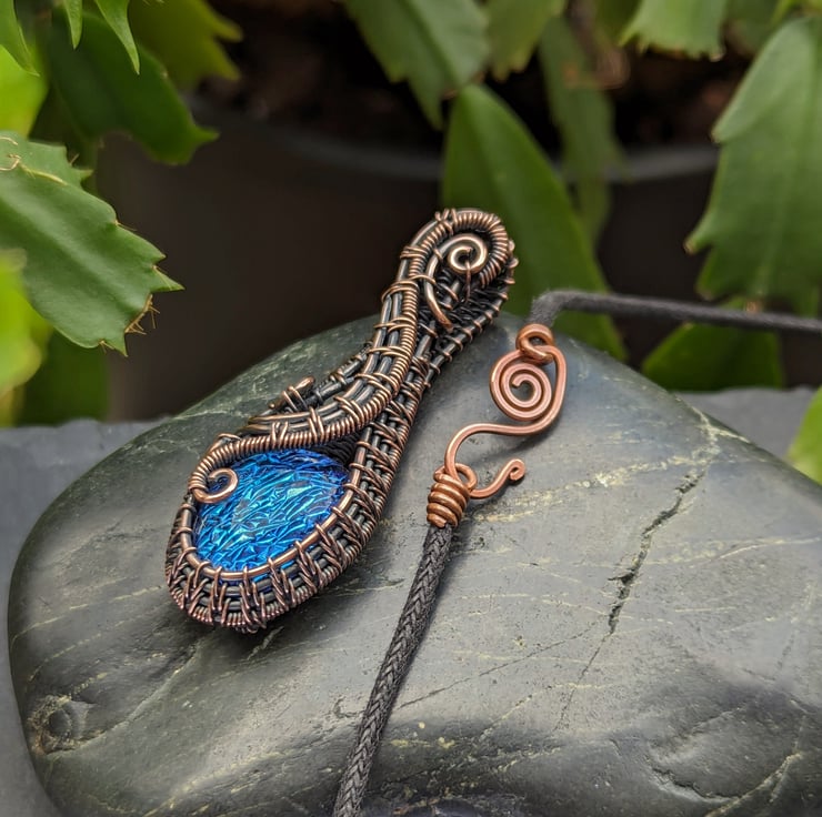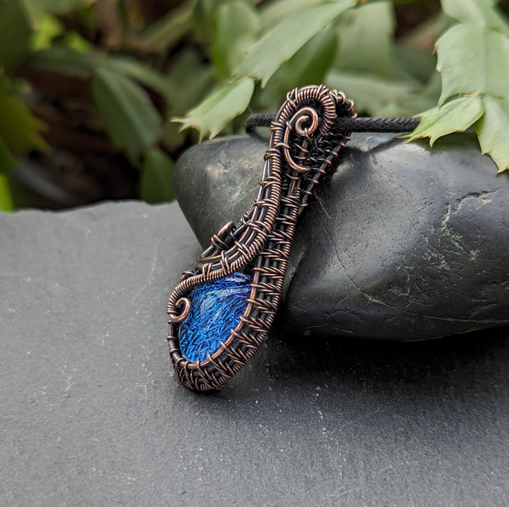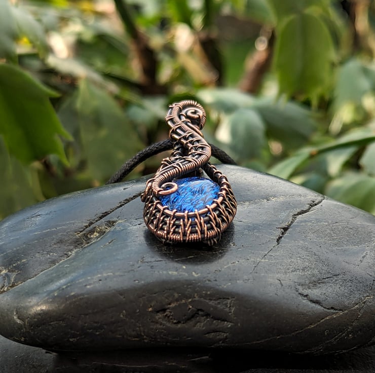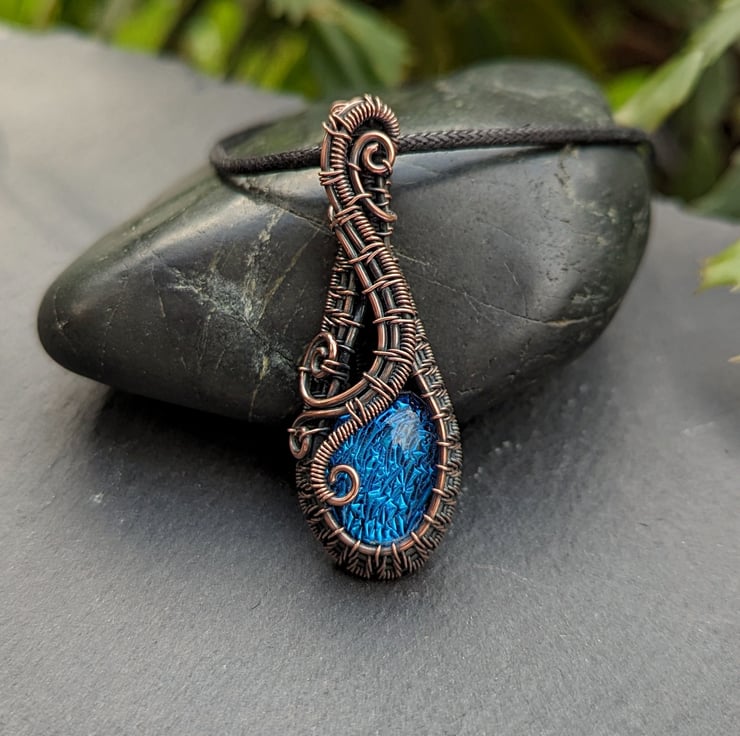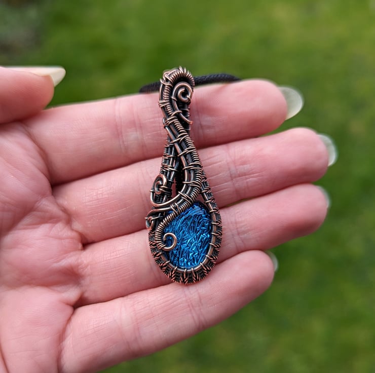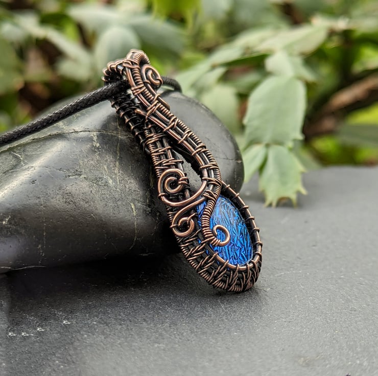 The gorgeous blue dichroic glass has been handmade in the UK and has a fantastic crinkled finish inside which really catches the light. I’ve oxidised the finished pendant and polished up all the bare wire to really highlight the details of the wire weaving - the antiqued copper perfectly compliments the sparkly blue glass.