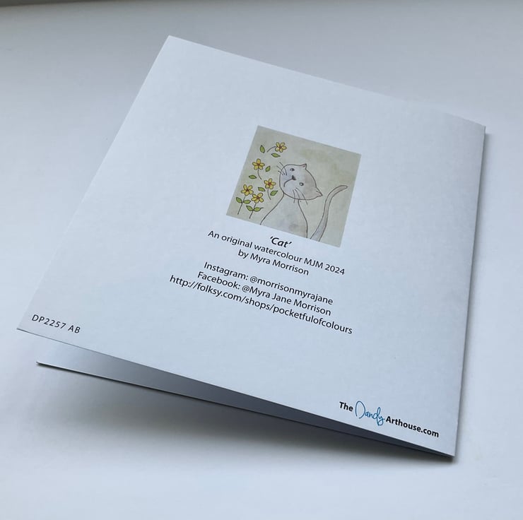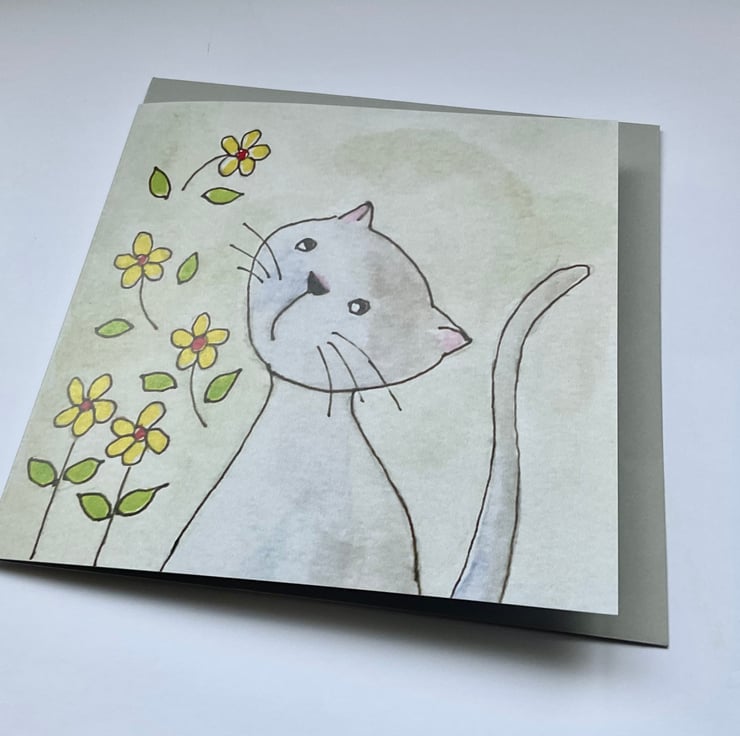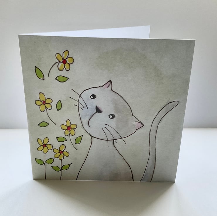 This cute card features a cat and some floating flowers in watercolour and ink. The greetings card is blank inside for your own personal message’ .The card would be suitable for any occasion such as Easter,birthday,special occasion,thank you,friend ,or maybe for a keen cat lover