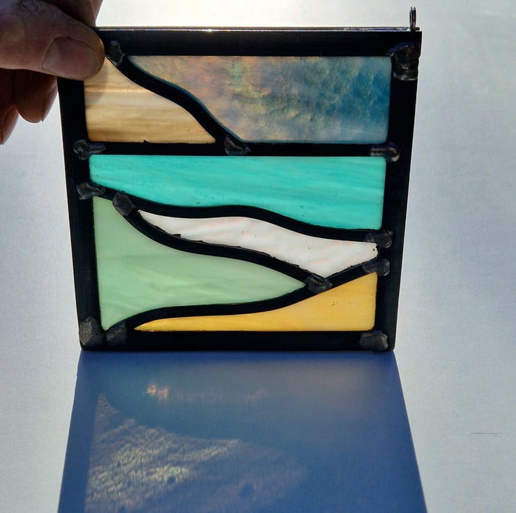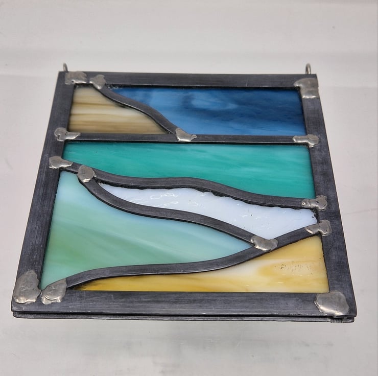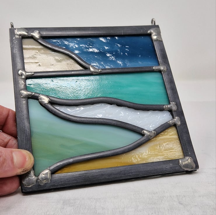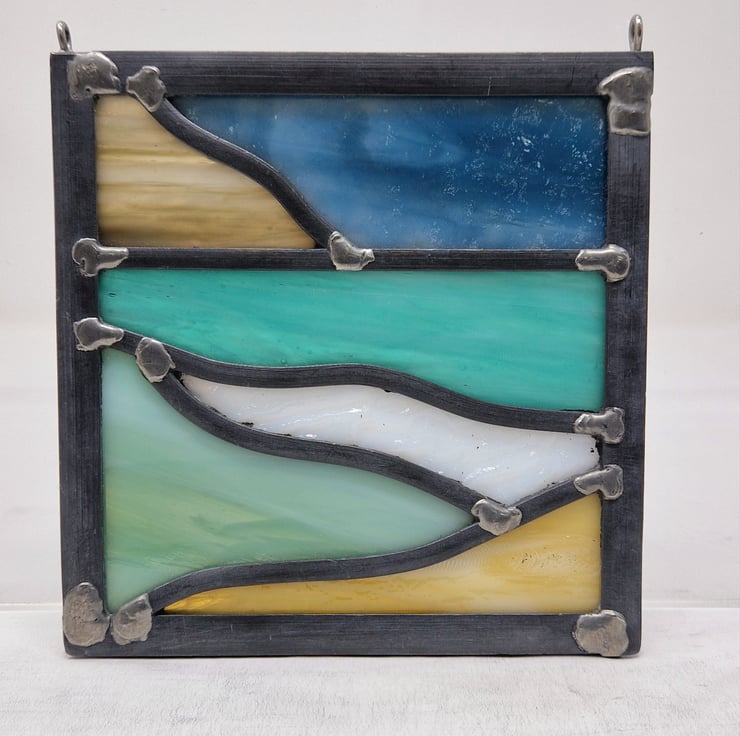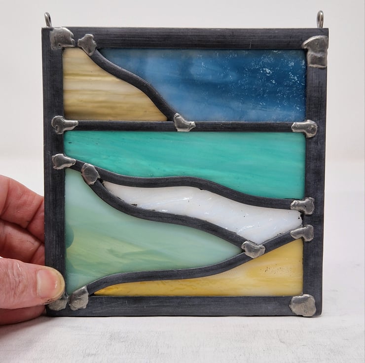 This small leaded panel is a study of Scottish west coast beaches. A dark blue sky sits behind a beige distant hillside. The sea towards the horizon is a vibrant turquoise. Coming forward I have used a heavily textured white for a breaking wave, a sage green for foreground water and soft amber sand.