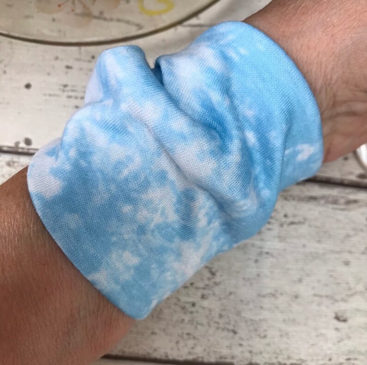 A tie dye look jersey cuff. Made to order. Wide wrist cuff bracelet in Sky blue and white jersey tie dye look. Made with a twist style. Double sided. A great fashion accessory to add a bit of fun to your everyday wear.